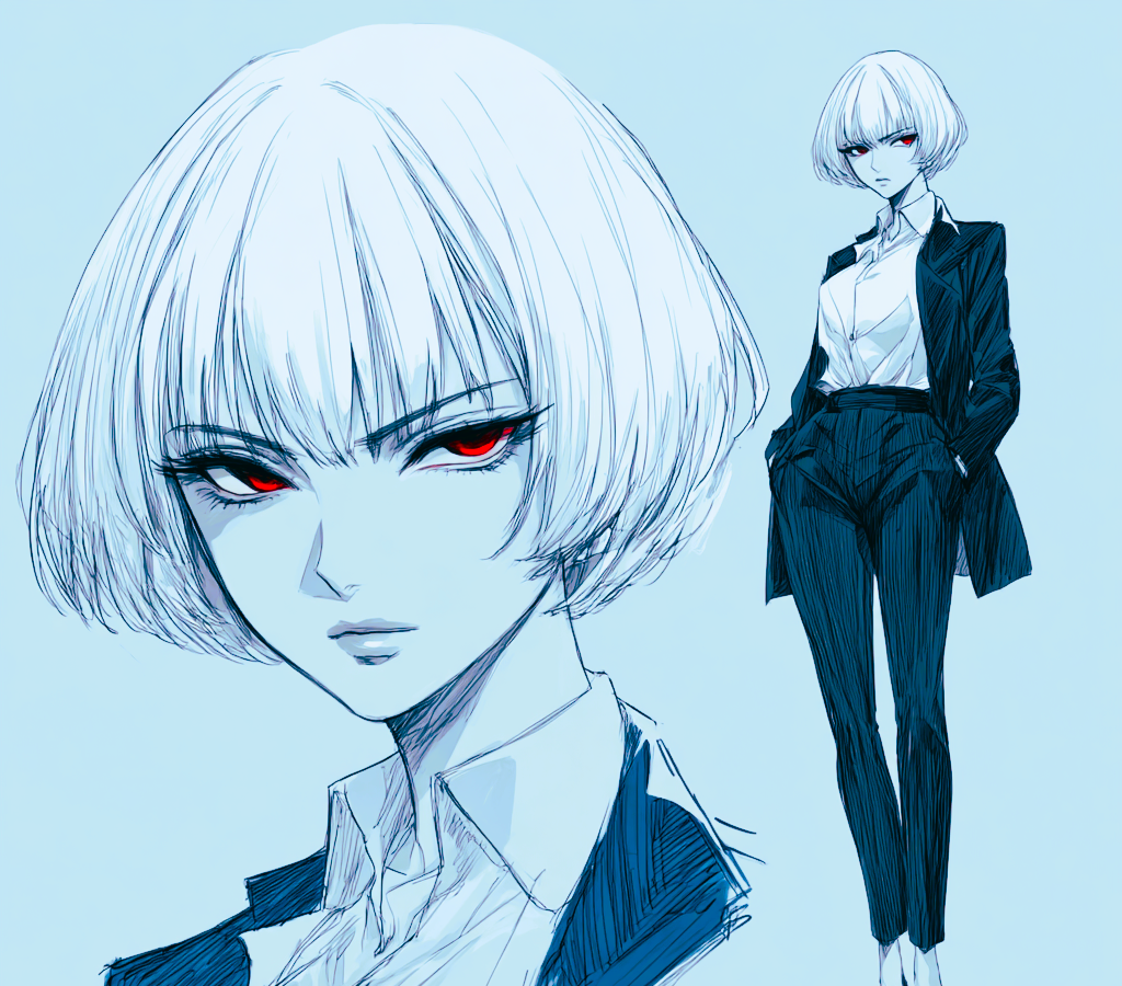 Белоснежное каре часто выглядит взъерошенным. Ее красные глаза без зрачков мерцают голубыми огоньками и постоянно двигаются. Носит строгий костюм (белая рубашка, синий пиджак, брюки), но выглядит он слегка небрежно — пиджак расстегнут, подтяжки перекошены.
