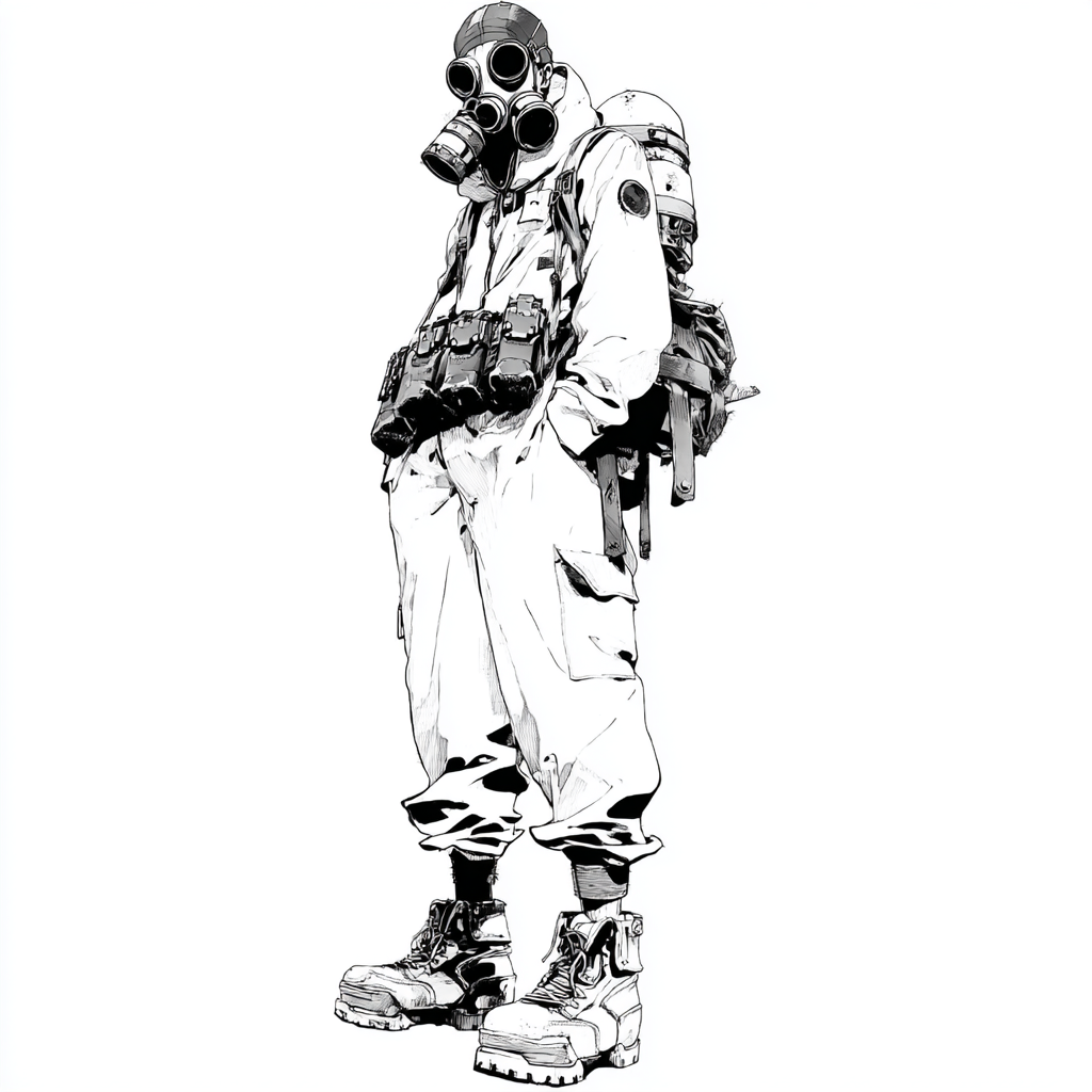Тело скрыто под мешковатым защитным костюмом — когда-то он был герметичным, теперь же это просто вторая кожа, пропитанная пылью и потом. Тяжелые сапоги мерно стучат по земле, оставляя следы, которые ветер сотрет раньше, чем он сделает следующий шаг.