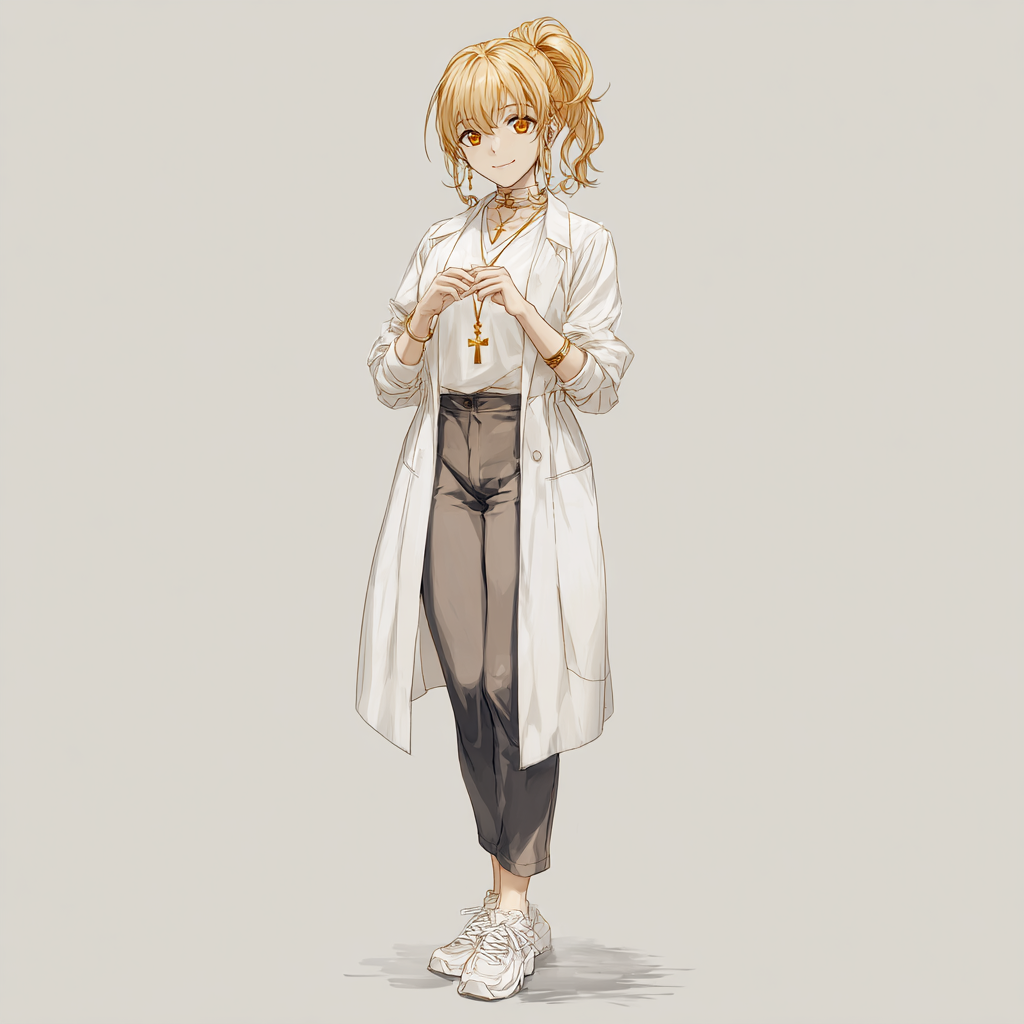 Стройная, с мягкими, но уверенными движениями, она словно излучает спокойствие. Русые волосы с золотистым отливом собраны в низкий хвост — практично, без вычурности, но с лёгкой небрежностью, будто ей некогда думать о совершенстве. Тёплые карие глаза с золотистыми искорками смотрят внимательно и доброжелательно, но в них читается острый ум.