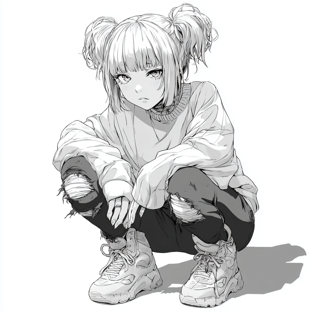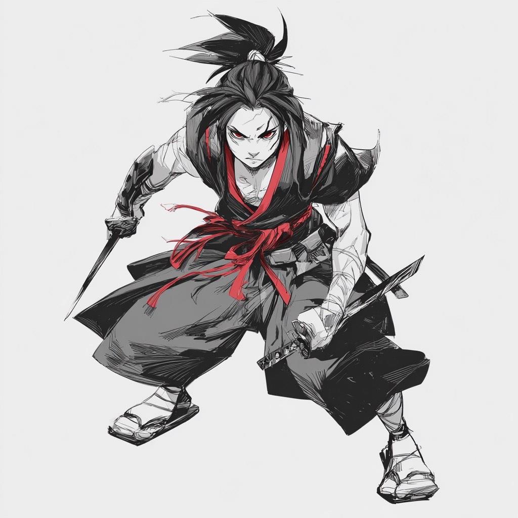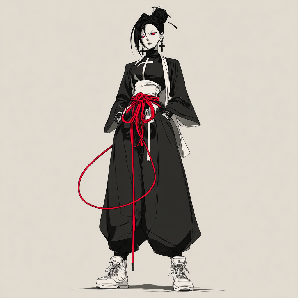 Одежда её — смесь традиционного и бунтарского: чёрное кимоно с перевёрнутым белым крестом на спине, развевающееся при каждом шаге, словно крылья ворона. Широкие брюки-палаццо скрывают стремительные движения, а белые кеды резко контрастируют с её мрачным обликом — будто намёк на то, что даже в хаосе есть свои правила.