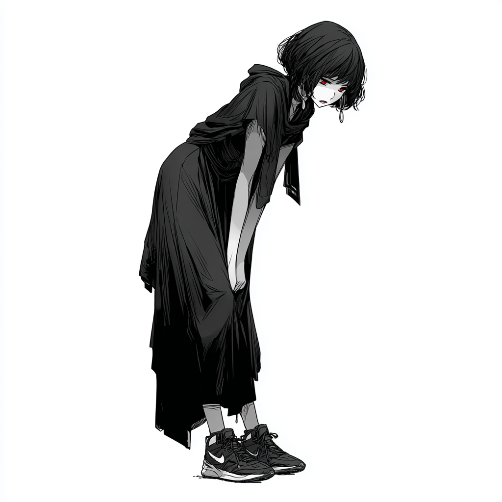 Высокая и хрупкая, как тень в сумерках. Её чёрные короткие волосы слегка растрёпаны, словно она только что проснулась от тревожного сна. Красные глаза — широкие, настороженные, будто постоянно ожидающие опасности. В ушах — простые серые серёжки, единственное украшение, которое она не решается снять.