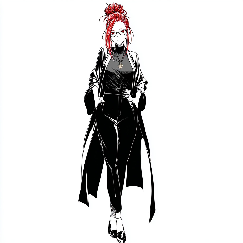 Стройная, с кошачьей грацией, она движется так, будто знает, что все взгляды — её собственность. Огненно-рыжие волосы, собранные в высокий, слегка небрежный пучок, будто языки пламени, венчающие её гордую осанку. Алые глаза смотрят томно, но в их глубине — острый, как бритва, ум.