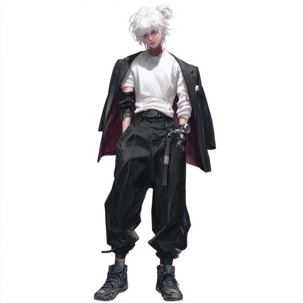Стройный, подтянутый парень с вечно озорным блеском в алых глазах — будто только что провернул какую-то шалость. На шее — татуировка (то ли демонический символ, то ли просто глупая надпись, сделанная в пьяном угаре). Одевается хаотично: сегодня — рваный худи и треники, завтра — кожаная куртка с шипами, послезавтра — вообще пижама в магазин. Главное правило — никаких правил.