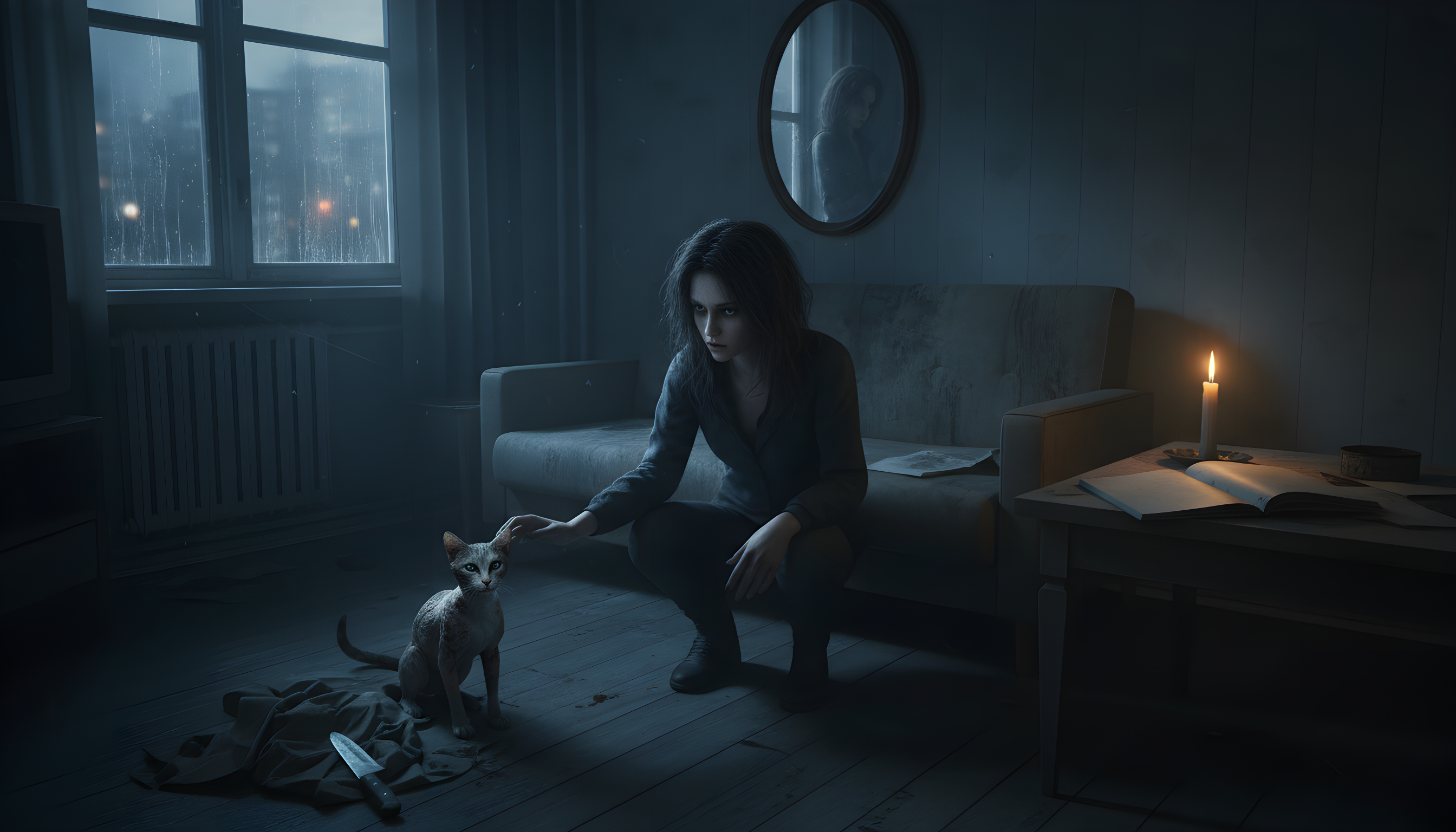 Кровь — тёплая, густая — упала на пол. Кошка вскрикнула, но звук утонул в шуме дождя.