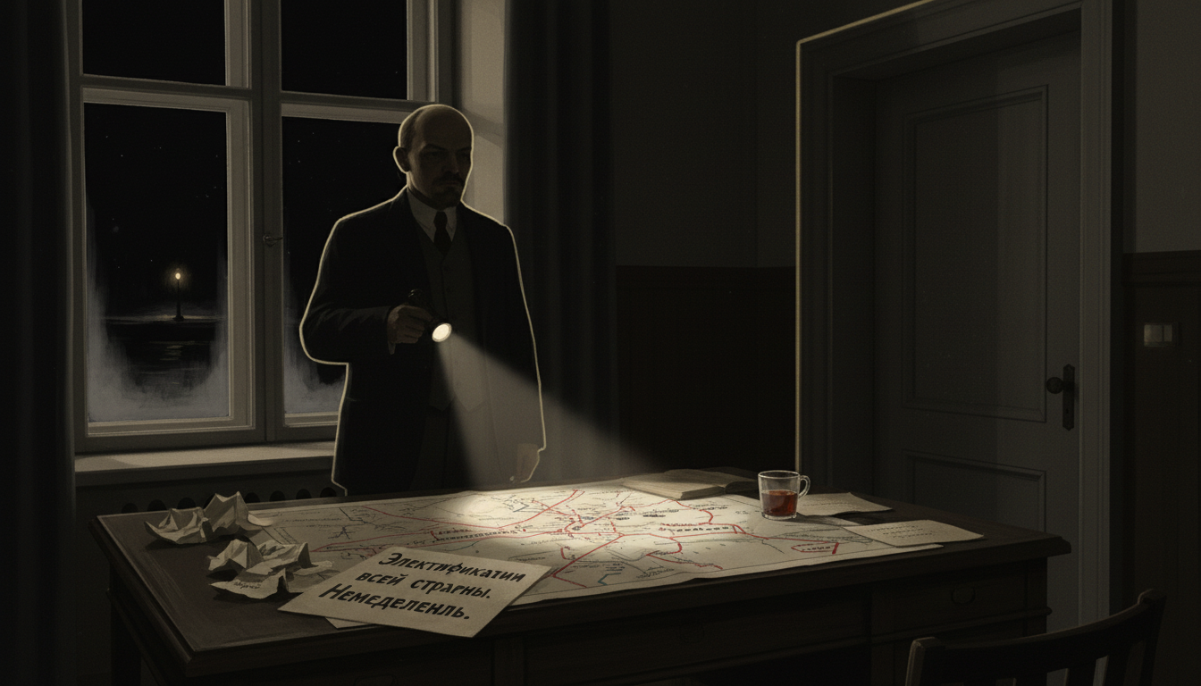 Он читал, не моргая. Потом отодвинул бумаги, достал из ящика стола маленький электрический фонарик — трофей с фронтов мировой войны. Щёлкнул кнопкой: тонкий луч вырвал из тьмы угол карты, где красными линиями были отмечены электростанции. Почти все — перечёркнуты чёрным.
