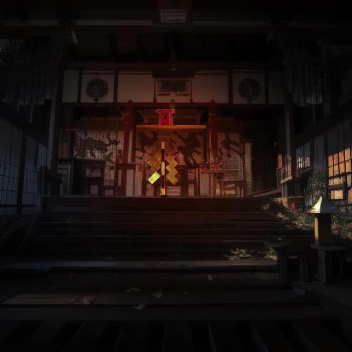 Он оказался в довольно просторном помещении. Здесь пахло кедром и прелой листвой. Этой самой листвы на полу прело изрядно — похоже, она налетела сквозь решётчатые ставни, с которых сошла бумага. Под слоем листьев угадывались очертания того, что когда-то было татами, а по центру помещения торчали развалины какого-то столика.