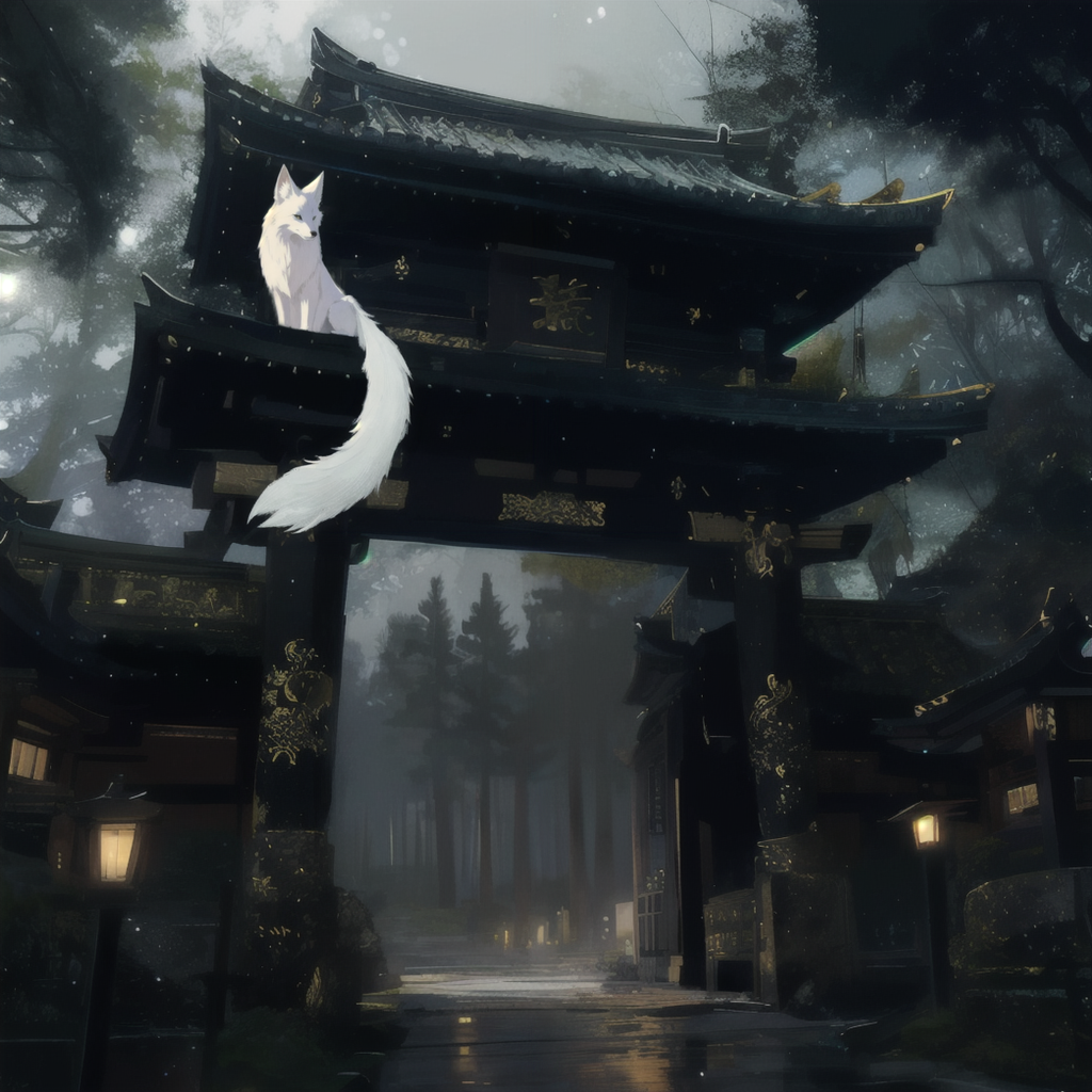 Что-то сверкнуло наверху. Задрав голову, Киёмару увидел очередной бумажный зигзаг — но нет, он ошибся! Это был белый хвост. Хвост белой лисы, которая сидела на воротах. Она мягко светилась, а её чёрные глаза внимательно рассматривали цукумогами. Киёмару уже испугался, что лиса не пустит его за ворота, но зверь вдруг отвернулся и канул куда-то за стену, только мелькнул светящийся белый хвост.