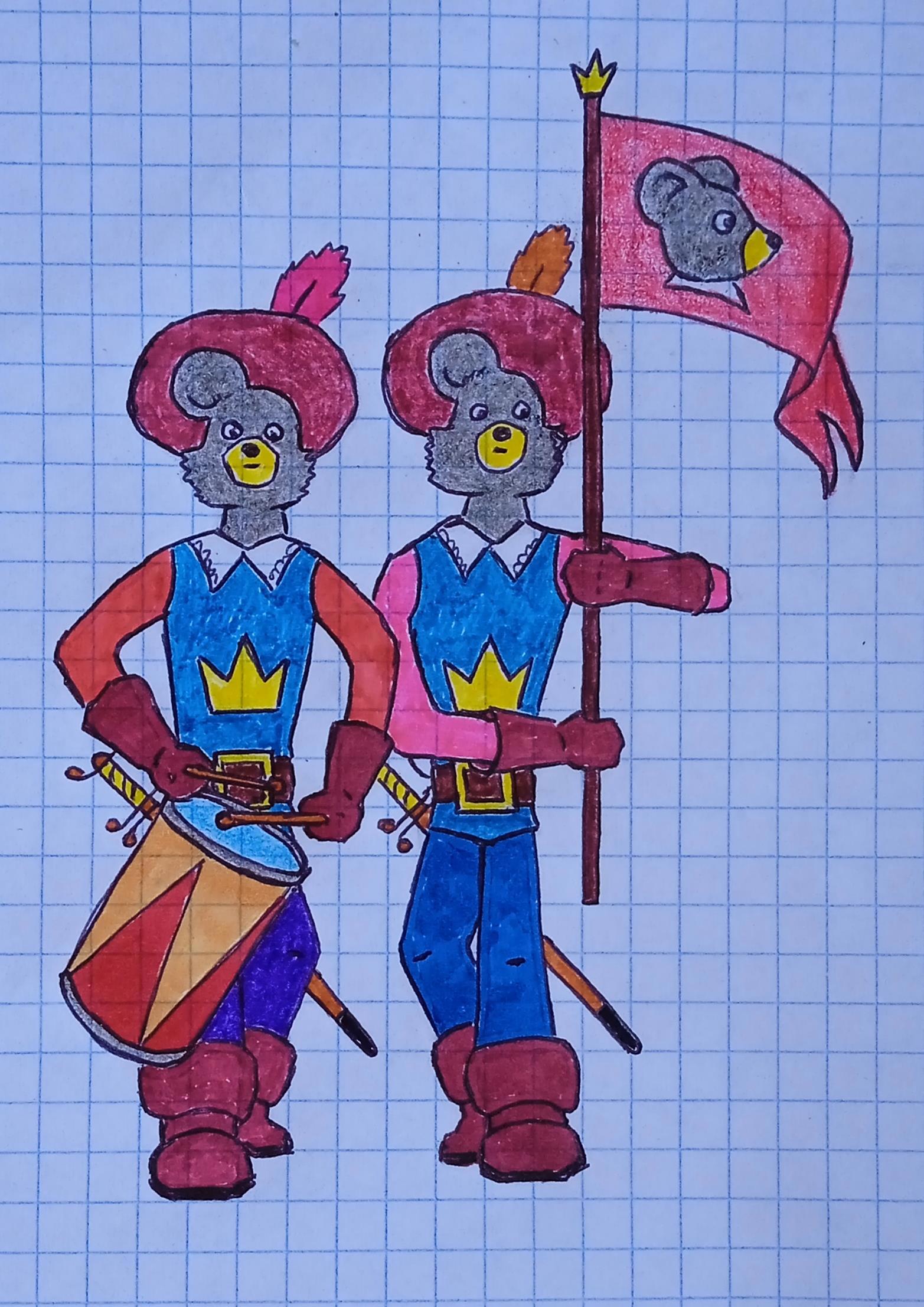 А потом показались и сами королевские мышкетёры, которые шли в строю по двое в ряд и во всё горло пели эту песню. Первый мышкетёр нёс красное знамя с профилем мышиного ккороля. Второй мышкетёр шёл с барабаном и отбивал марш. Остальные маршировали следом.