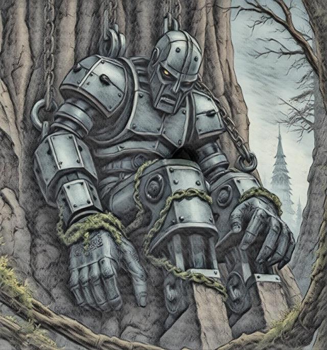 Долго странствовал Вилли по свету . Вдруг , посреди гор в самом непроходимом месте наткнулся он на маленькую полянку , а на полянке сидел огромный , старый , покрытый ржавчиной железный человек , прикованный цепью к скале . Глаза его мерцали , подобно уголькам .