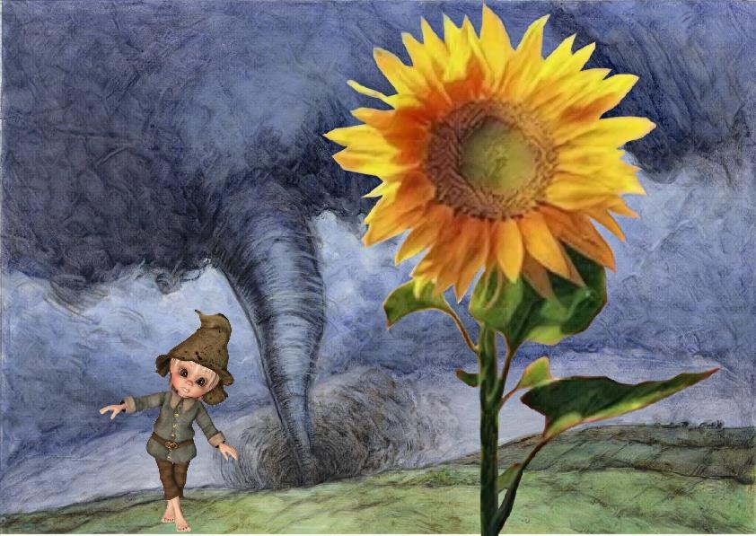 Тут же из земли взмыл вверх яркий , подобно солнцу — подсолнечник . Свет от него был таким сильным и жарким , что смерч быстро рассеялся . Третий Великан , ослеплённый , упал на землю . И все три Оборотня-Великана приняли свой истинный облик — облик старых , жадных карликов-колдунов .