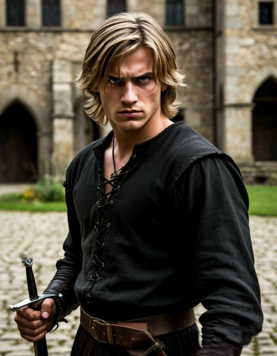 Барон де Суэз застал во дворе настоящее побоище. Стража пытались защитить баронский слуг, а заодно и лошадей, принадлежащих гостям. Три стражника стояли кучкой, выставив копья, но не прямо вперёд, а нерешительно, под углом. Нападал молодой рыцарь, высокий, стройный и, судя по всему, абсолютно бесстрашный. Он с такой яростью атаковал стражников мечом, что те втроём не успевали отбивать удары.