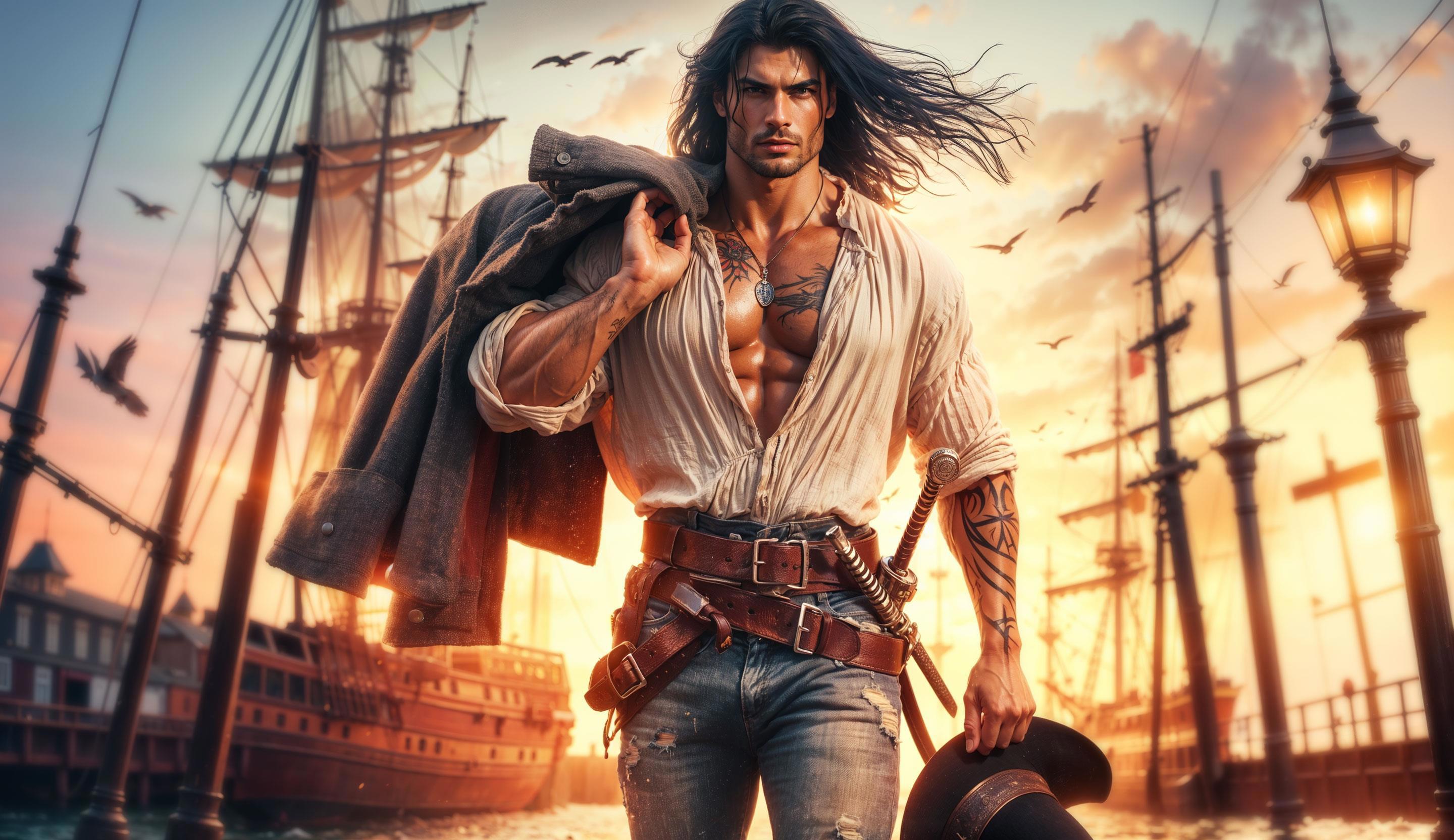 По пирсу от величественного покачивающегося на волнах фрегата идёт группа мужчин. Лиц не вижу из-за ослепляющего солнца, только силуэты. Но даже так взгляд цепляется за идущего впереди широкоплечего мужчину. Если все остальные ступают, как обычные моряки, раскачиваясь на ходу и широко расставляя ноги, этот скользит кошачьей походкой крупного хищника. Выглядит завораживающе.