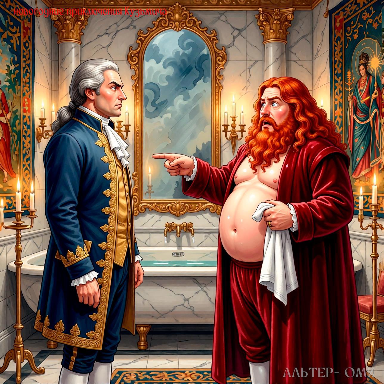 Увидев, куда показывает слуга, я развернулся и увидел огромное зеркало в золочёной раме. Оттуда на меня смотрел незнакомый мужик лет сорока пяти. Лицо круглое, щёки пухлые, нос картошкой. Борода окладистая, рыжая с проседью. Волосы до плеч, кудрявые.