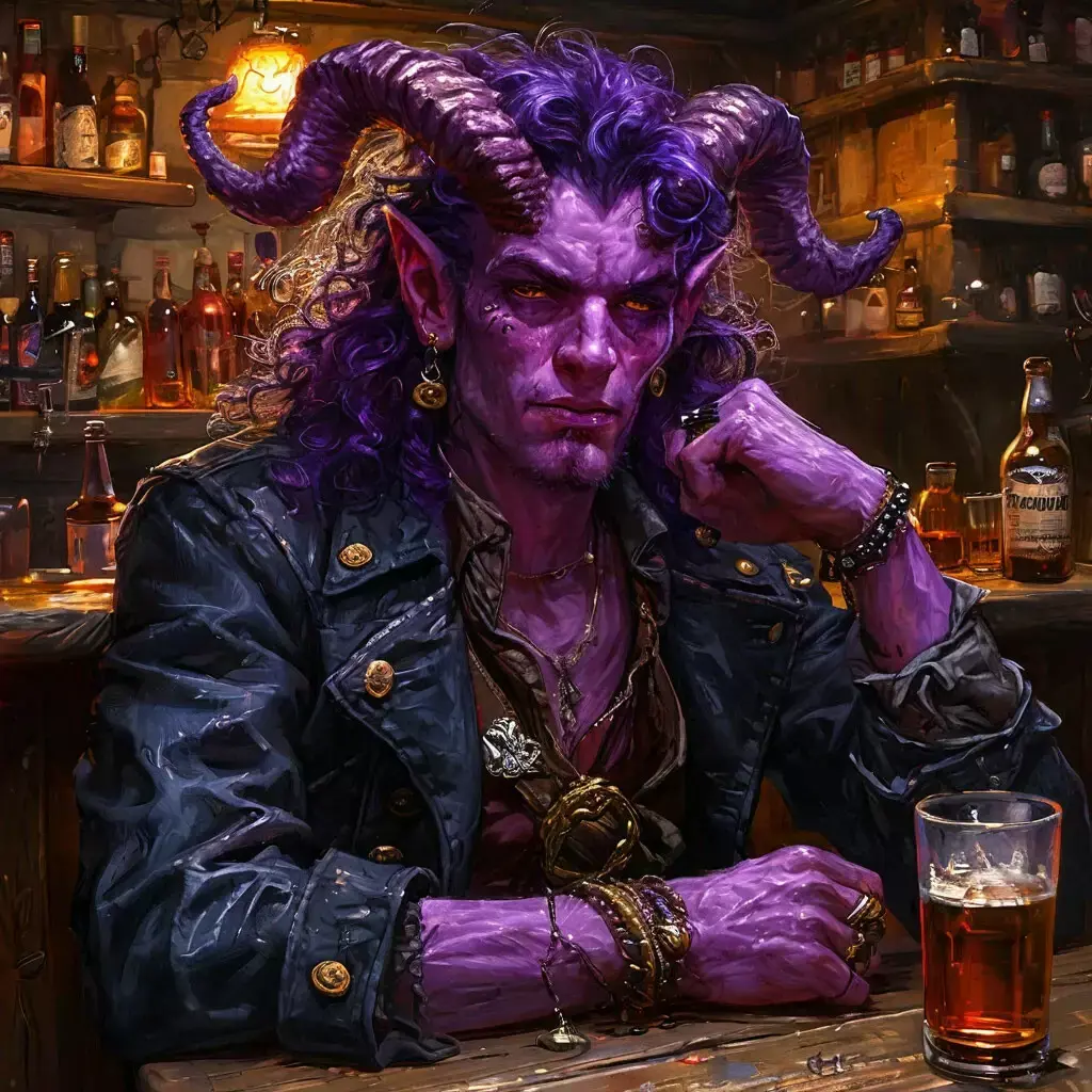 В паре столов от нее сидел не менее уникальный персонаж. Тифлинги вообще крайне редкие гости этих краев. Смесь демона и человека. Если убрать витиеватые рога и фиолетоватую кожу, вполне обычный человек, но нет. По его внешнему виду можно сказать, что он только что сошел с корабля. Тельняшка, что красовалась под курткой и манера общаться морскими словечками, говорили, что он либо отличный моряк или пират, что тоже не редкость. Несмотря на свою своеобразную внешность, вокруг него толпилось пару зевак и слушали его истории про покорение водных просторов и сражения с морскими чудищами.