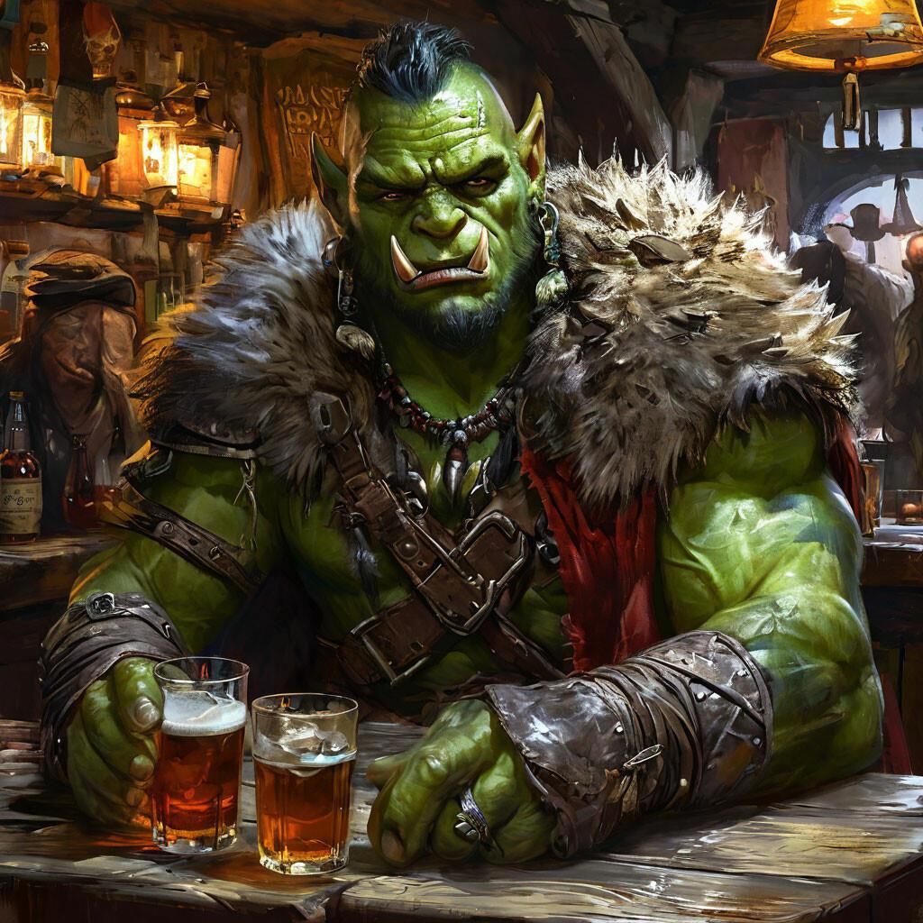 В таверне сидело множество только что прибывших авантюристов. Как вполне обычных на вид, но также среди них хватало и отдельных "уродцев" по меркам местных. Один их них орк, точнее полуорк, хотя его размеры и мускулы говорили об обратном, многие шугались его, думая, что чудовище вышло из леса по их души, но зеленый великан вполне себе громко ел, пил, много пил и культурно рыгал на всю таверну, так что стены слегка поскрипывали. Местный народ просто "проглатывал" такое поведение из-за страха быть раздавленными его ручищами. А окровавленная секира у барной стойки добавляла шарма к его и без того ужасающему образу.
