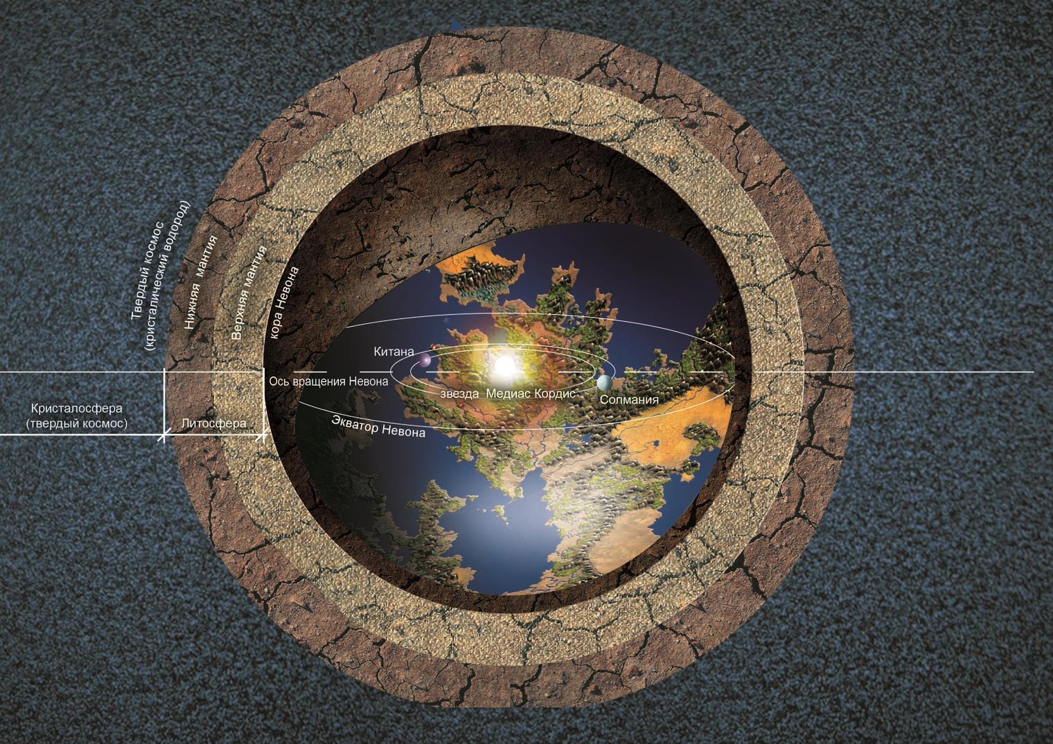 Постепенно, с каждой прочитанной страницей, перед ним раскрывался огромный и таинственный мир, который показался бы чрезвычайно фантастичным обитателям Универсума Корпорации. Невон поразил даже привыкшего к космическим эллипсоидам и плоским мирам демиурга. Еще бы — на атласе изображался не мир-шар, как можно было подумать, а мир-пузырь, мир-каверна. Планета, вывернутая наизнанку, окруженная со всех сторон бесконечной твердью и пустая внутри! Подтвердилось то, что ему поведал серв у фонтана.