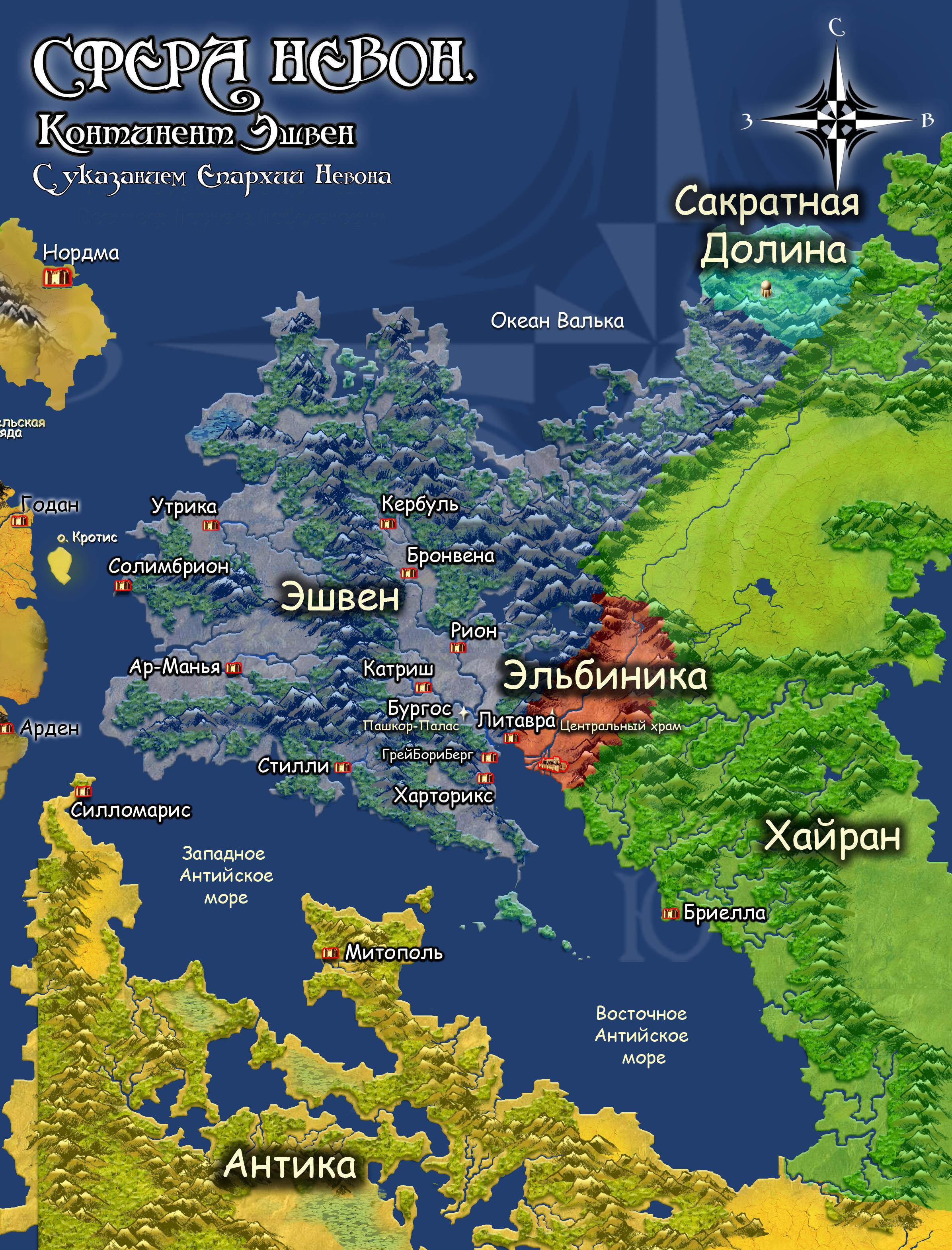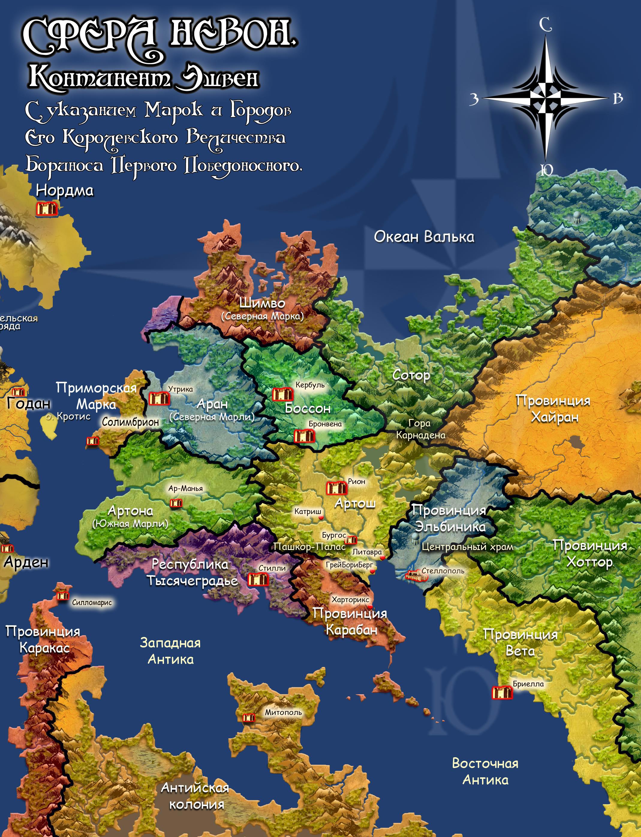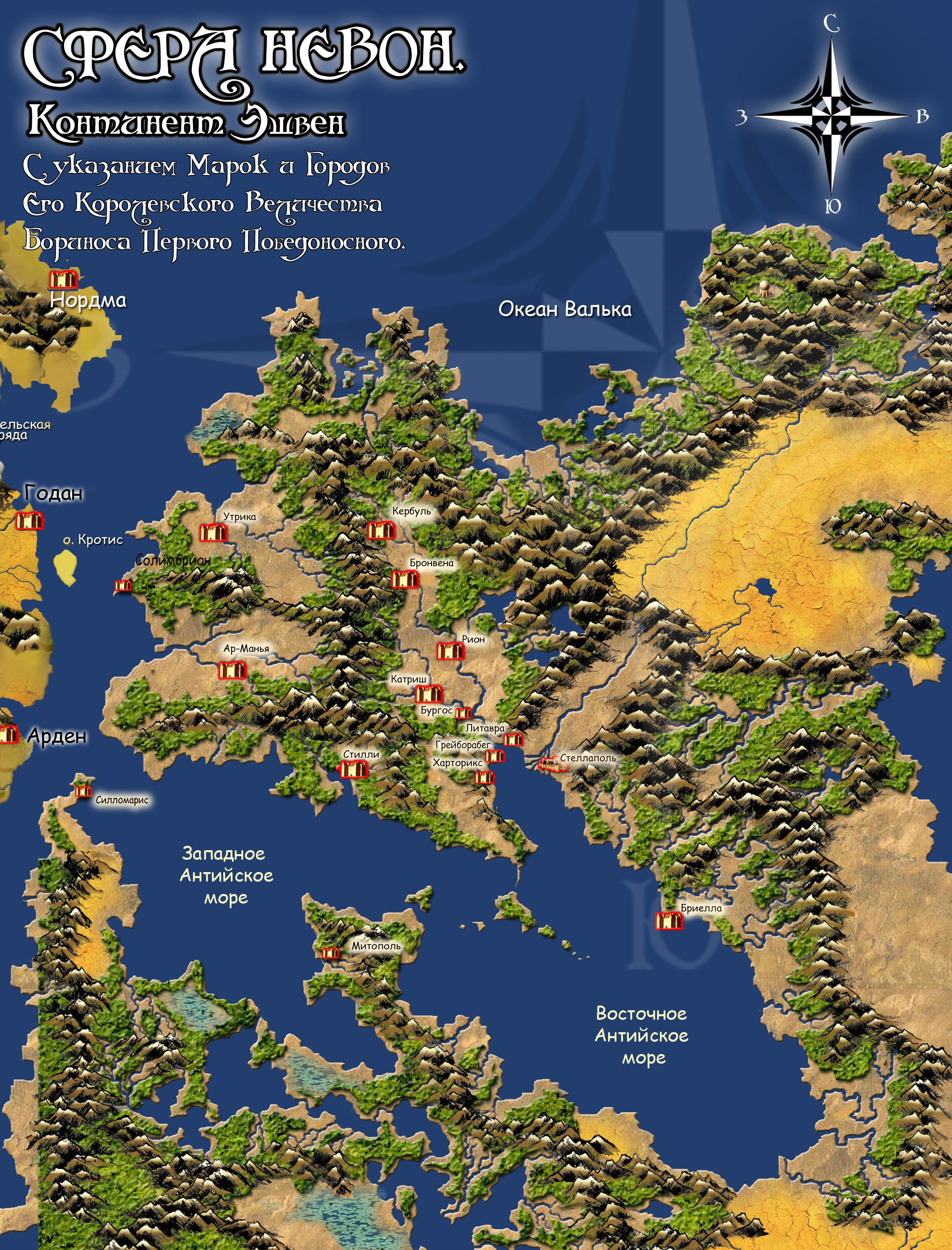 «КАВЕРНА НЕВОН. Континент Эшвен с указанием марок и городов Его Королевского Величества Бориноса Первого Победоносного».