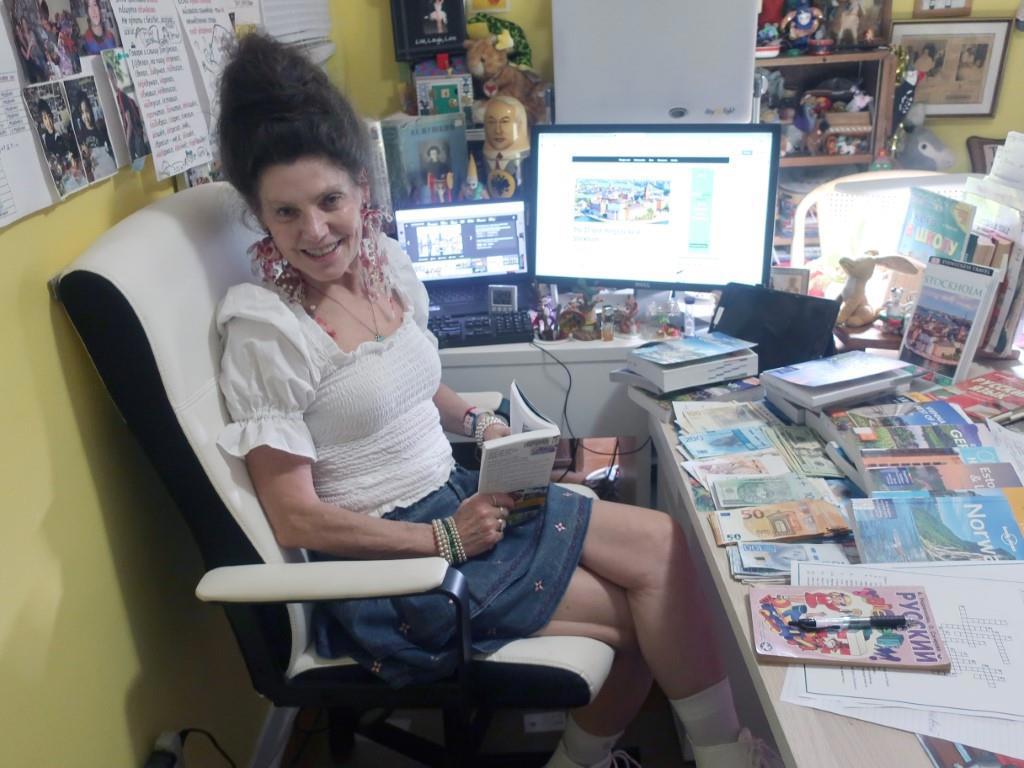Вот жена сидит в своём классе русского языка и литературы, просматривает путеводители по городам, которые мы планируем посетить; знакомится с валютой этих стран. Кроме того, вместо того, чтобы уделить всё внимание подготовке к поездке, она усердно готовит задания для своих учеников, чтобы они не расслаблялись, и новые уроки, которые она планирует провести по приезду.