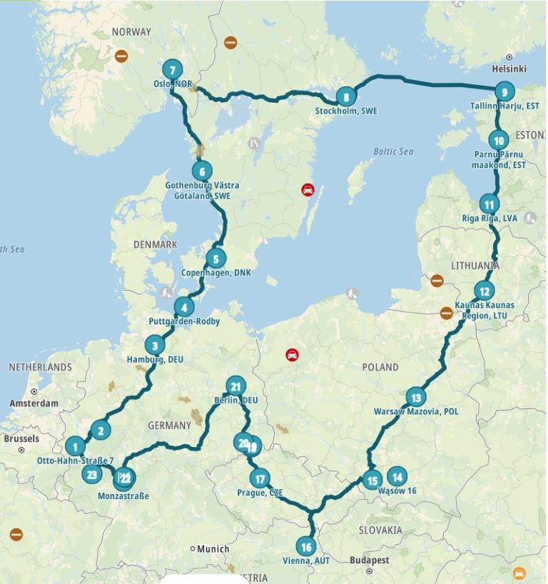 Маршрут был таким: Франкфурт-> Изерлохн-> Гамбург-> Копенгаген-> Осло-> Стокгольм-> Таллин-> Пярну-> Рига-> Варшава->Величка Соляная шахта-> Освенцим-> Вена-> Прага->Крепость Кёнигштайн->Бастай мост-> Дрезден-> Берлин-> Оффенбах-> Монтабаур -> Ерлц Замок-> Франкфурт.