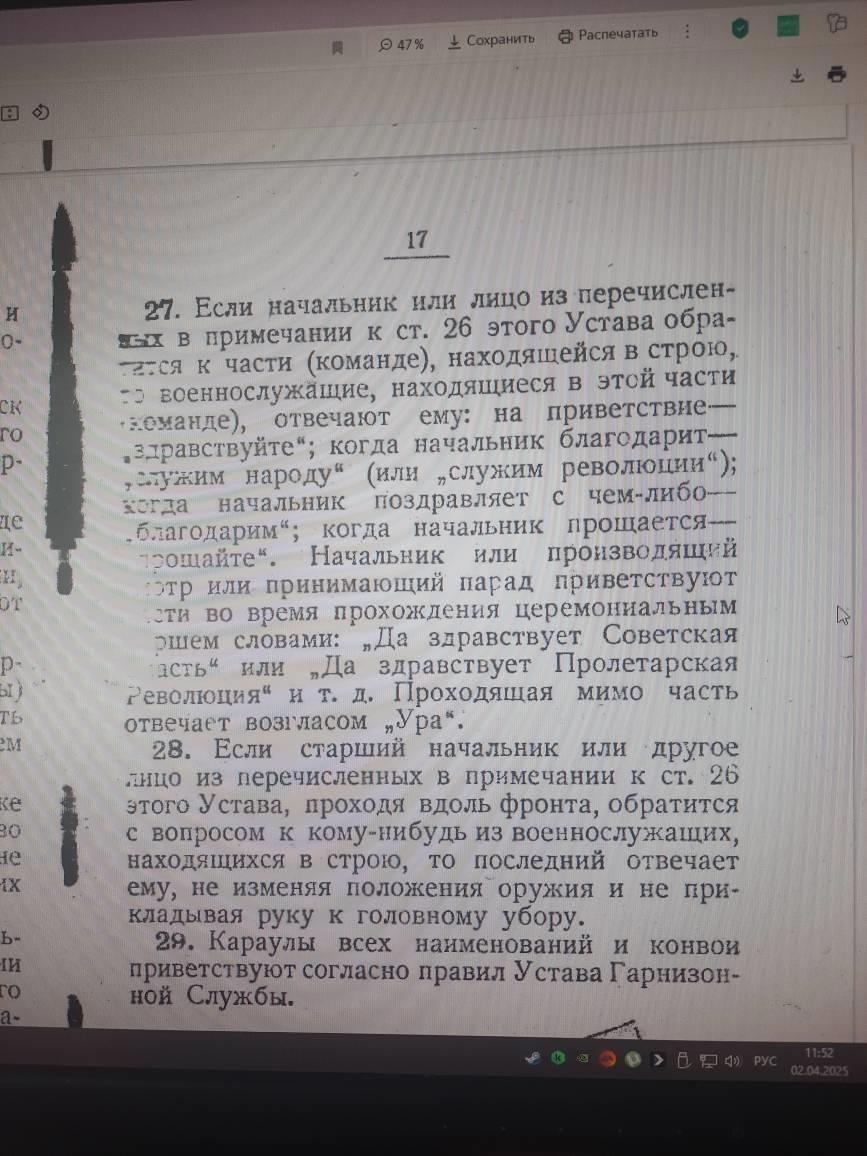 Статья 31. Если начальник здоровается с частью или отдельными военнослужащими, они отвечают –Здравствуйте! На поздравление - воинская часть (подразделение) отвечает протяжным криком "ура", а отдельные военнослужащие - "благодарю". На благодарность воинская часть и отдельные военнослужащие отвечают: "служим (служу) Советскому Союзу". На прощание - отвечают "до свидания".