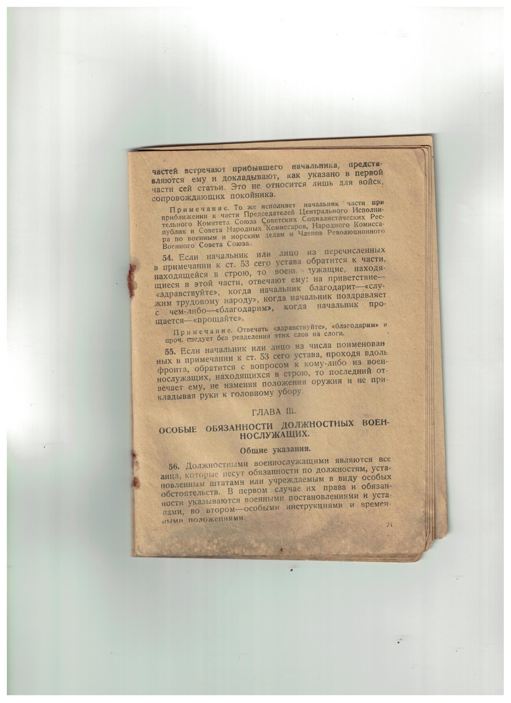 Красноармеец - боец Красной Армии - выполняет самую почетную в нашей стране обязанность - защиту социалистической родины. 183-миллионный советский народ, партия и правительство доверили ему самое мощное и совершенное оружие для борьбы с врагами социалистического государства. Красноармеец страшен врагам своей неугасимой ненавистью к эксплуататорским классам, своей беззаветной преданностью делу партии Ленина-Сталина, героической самоотверженностью в борьбе за счастье народа. Красноармеец - примерный гражданин страны Советов и на службе, и в быту. Он дисциплинирован, культурен. Он дорожит своей красноармейской честью и никогда не умаляет достоинства революционного воина. В обращении с гражданами красноармеец выдержан, вежлив. Он готов оказать помощь всякому, кто слабее, кто в ней нуждается, особенно детям, женщинам, старикам. Свои отношения с товарищами по военной службе и начальниками красноармеец строит на основе полного взаимного уважения.