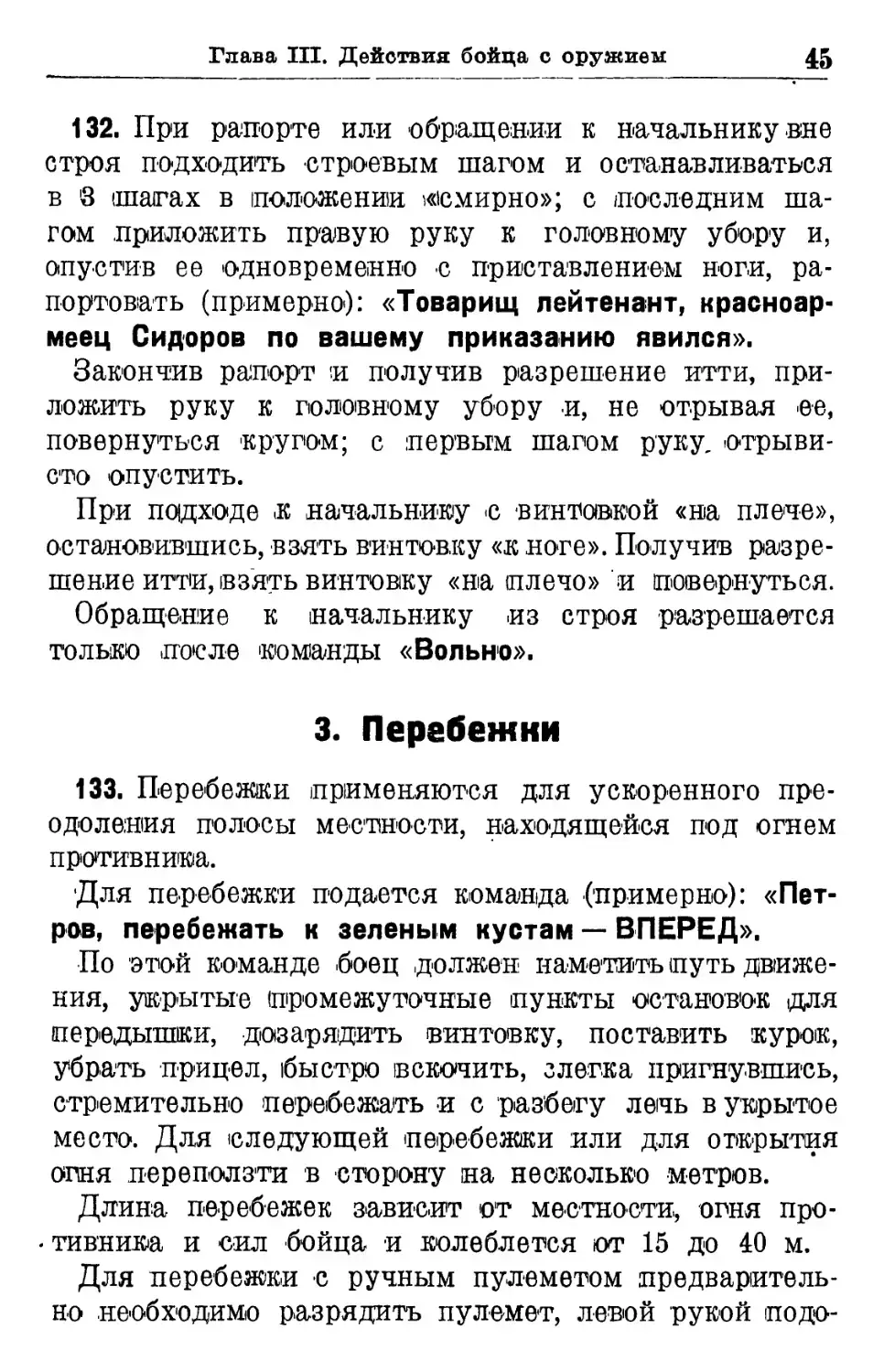 Статья 63. При рапорте или обращении к начальнику вне строя подходить строевым шагом и останавливаться в трех шагах в положении “смирно”; с последним шагом приложить правую руку к головному убору и, опустив ее одновременно с приставлением ноги, рапортовать (примерно): “Товарищ лейтенант, красноармеец Сидоров по вашему приказанию явился”.