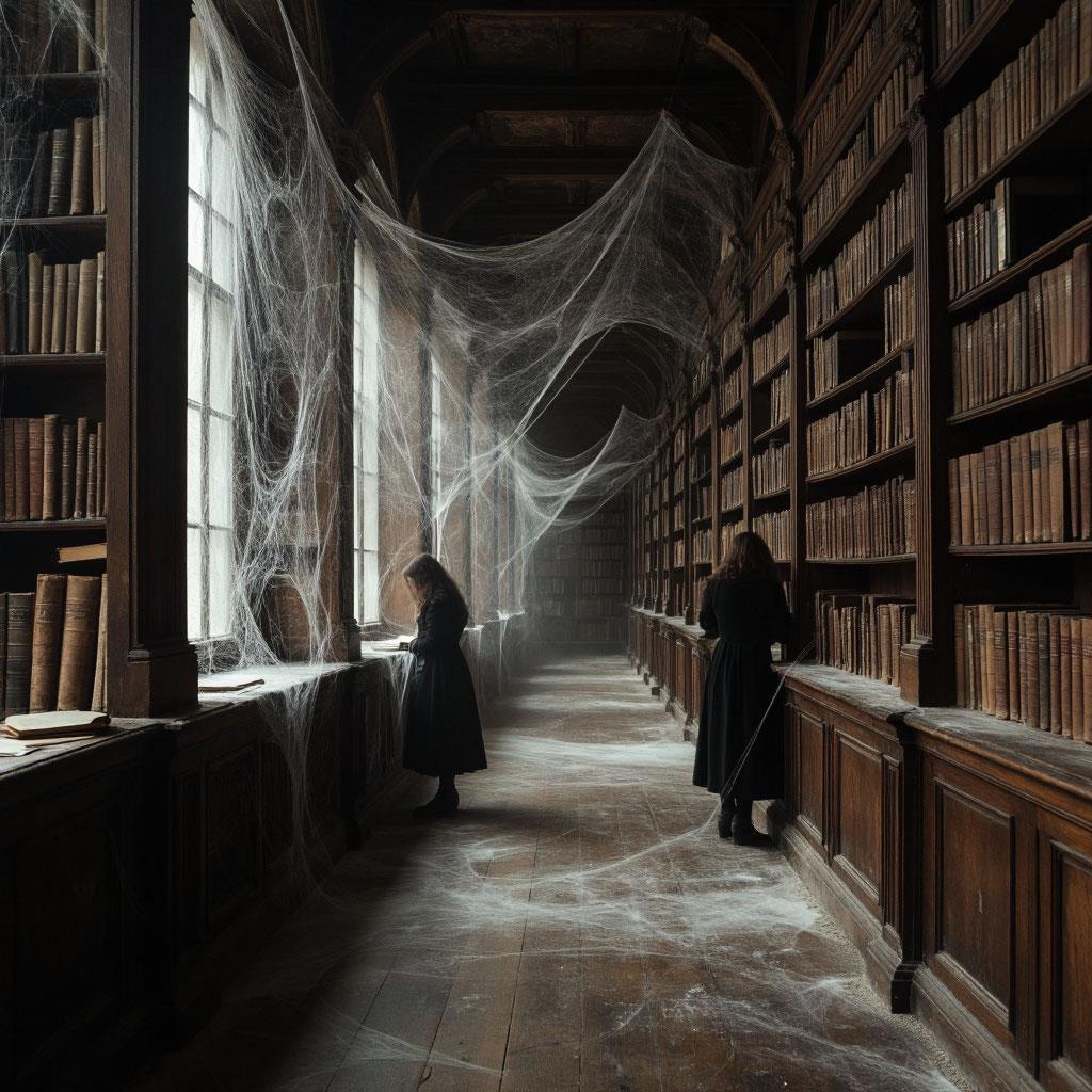 Увиденное повергло всех в полнейший ужас. Посреди пустого помещения с обшарпанными стенами и такими же пустыми стеллажами, на которых теперь была лишь вековая паутина в несколько слоёв, стоял большой стол, за которым на старинных стульях сидели мумии читателей, покрытые такой же вековой паутиной, как и на стеллажах, и на всех стенах в помещении бывшей когда-то здесь библиотеки. А на столе перед мумиями лежали такие же старинные книги.