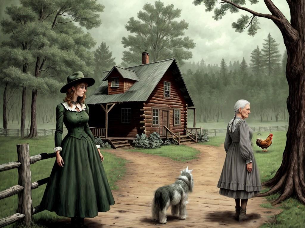 Уже под вечер, отчаявшись, Анюта наконец вышла из леса. Она увидела перед собой небольшую деревеньку. Несколько покосившихся от времени изб стояли вдоль пыльной дороги. Возле одной из них, у забора, Анюта увидела старую женщину в тёмном запылённом платье до земли и направилась к ней.