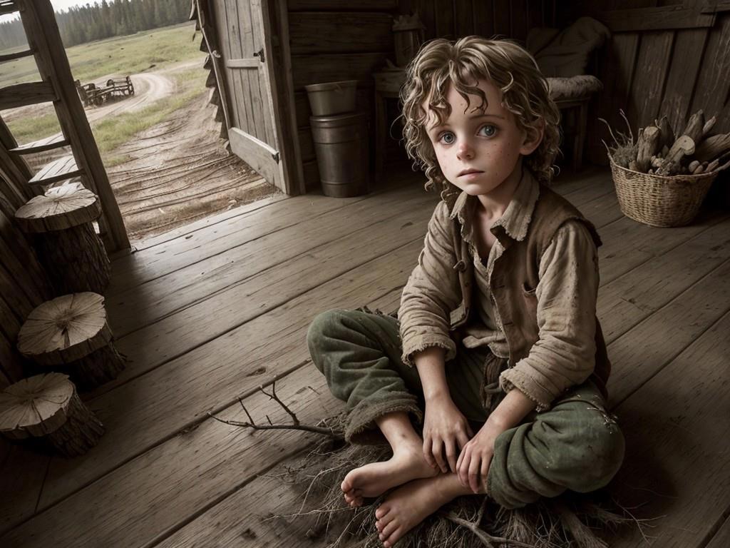 Анюта прогулялась по деревенской дороге, оглядела заброшенные избы. В одной открытой избе на деревянном полу сидел босоногий вихрастый пацан и мастерил что-то из ивовых прутьев. Рваная одёжа, давно не знавшая стирки, ободранные ноги и любопытный взгляд.