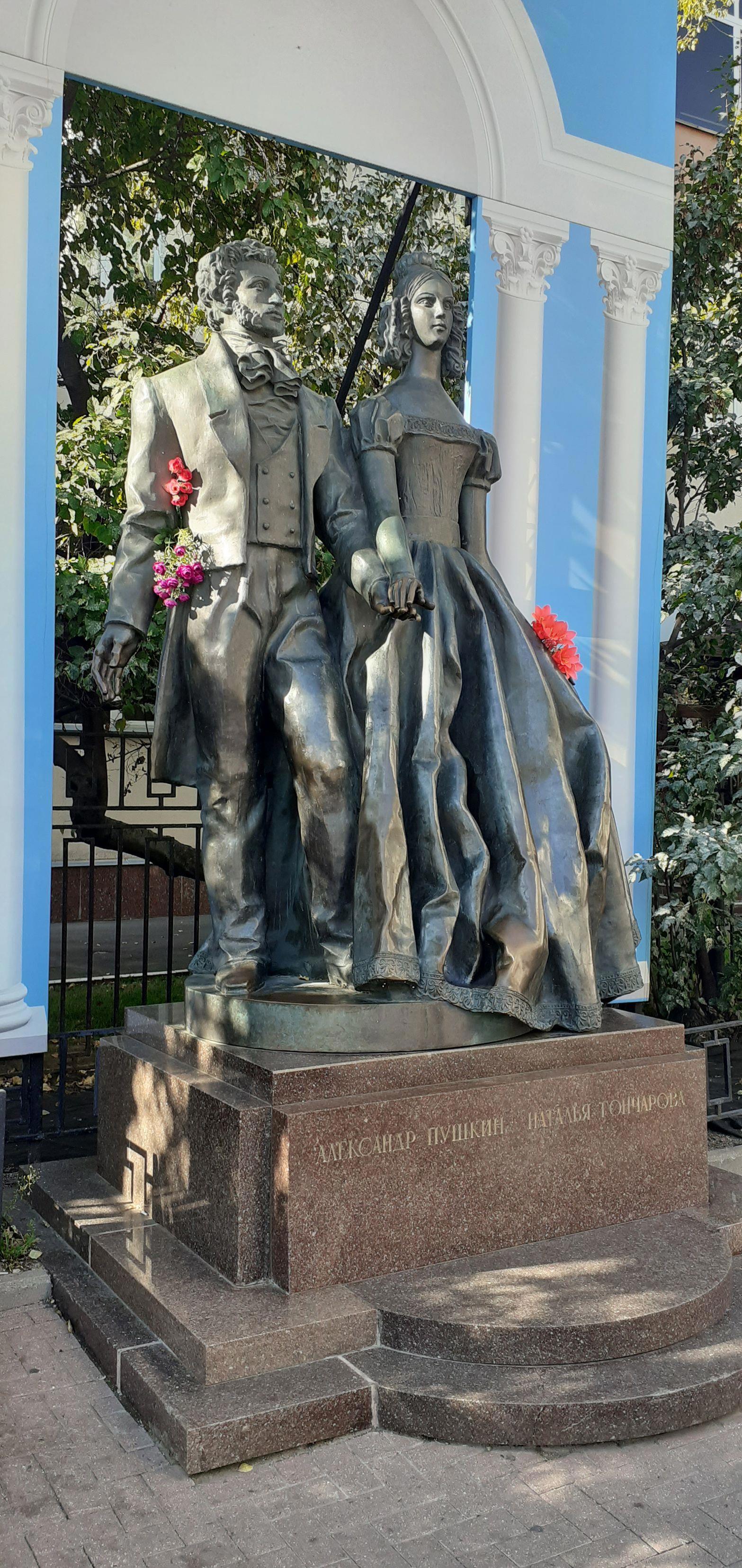 Естественно, будучи в златоглавой столице, не мог не посетить Старый Арбат. Видел и сфотографировал скульптурную пару - Александра Пушкина с Натальей Гончаровой. Скульпторы братья Иван и Александр Бурганов изобразили их максимально близкими к реальности, каковыми они вышли на крыльцо церкви «Большое Вознесение» в Строжах у Никитских ворот, где прошло бракосочетание. Поэт ниже ростом, как это и было на самом деле. Композиция установлена в 1999 году напротив того дома (улица Арбат, 53), в котором Александр Пушкин снял на полгода пять комнат второго этажа и 18 февраля 1831 года привёл сюда свою жену после свадьбы. Прожили они тут около трёх месяцев. Теперь в здании музей «Мемориальная квартира А.С. Пушкина». В руки застывших в бронзе скульптур кем-то были вложены живые цветы.