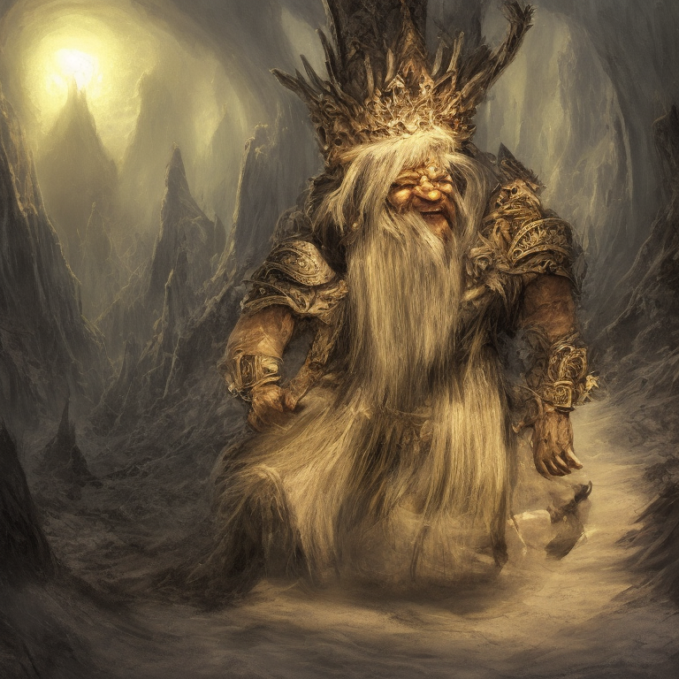 И вправду, гремит музыка всё сильнее, уже и уши болят, и едва успеваю я вступить с дудением в тот или иной момент, который подходящим кажется. Вдруг громыхнуло так, словно всю нечисть обнаружили и бомбардировщики напустили — гора задрожала, камни посыпались, распугав пляшущих, а прямо посередине зала появляется фигура. И невысокая, гораздо меньше высоченного чёрта, только вот одежды на нём золотые, на голове корона ветвистая, и лицо старческое вроде бы доброе, даже приятное, потому что всё улыбается. И щурится, обводит взглядом всех из-под ресниц.