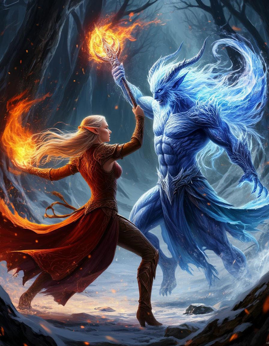 Лия не сдавалась. Она создала огненный вихрь, пытаясь окружить демона пламенем. Мраз только смеялся, легко уворачиваясь или гася её заклинания морозным дыханием.
