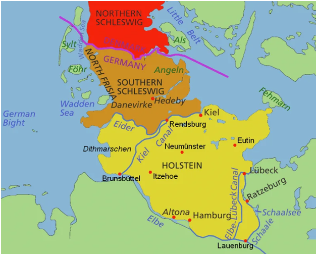 5. Возникшие в XII веке на юге Ютландского полуострова два герцогства Шлезвиг (скандинавское) и Гольштейн (германское) территориально не входили в состав Дании, но были связаны с ней личной унией. В XVI веке территории этих герцогств были разделены на три равные части: одна часть досталась королю Дании (старшая ветвь Ольденбургской династии), а две другие представителям младшей ветви Ольдендургской династии (герцогам). Позднее был еще один раздел, и королям Дании фактически достался весь Шлезвиг, а Гольштейн остался за герцогами.