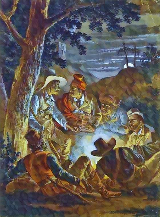 Он стараясь не шуметь , по лисьи , прокрался к толстенному дереву на краю поляны , выглянул , и чуть не ахнул . Ведь там он увидел разбойников .