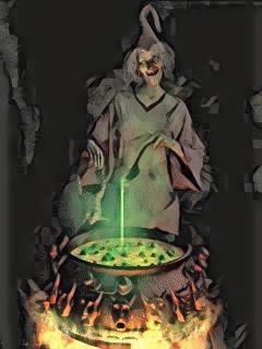 Костер взметнулся до небес , разбросав искры , похожие на красных пчёл . Котёл с похлёбкой перевернулся , затушив огонь . Вертел вылетел из рук разбойника и воткнулся в дуб , украсив его кабаньей тушей , словно это был не дуб , а рождественская ёлка .