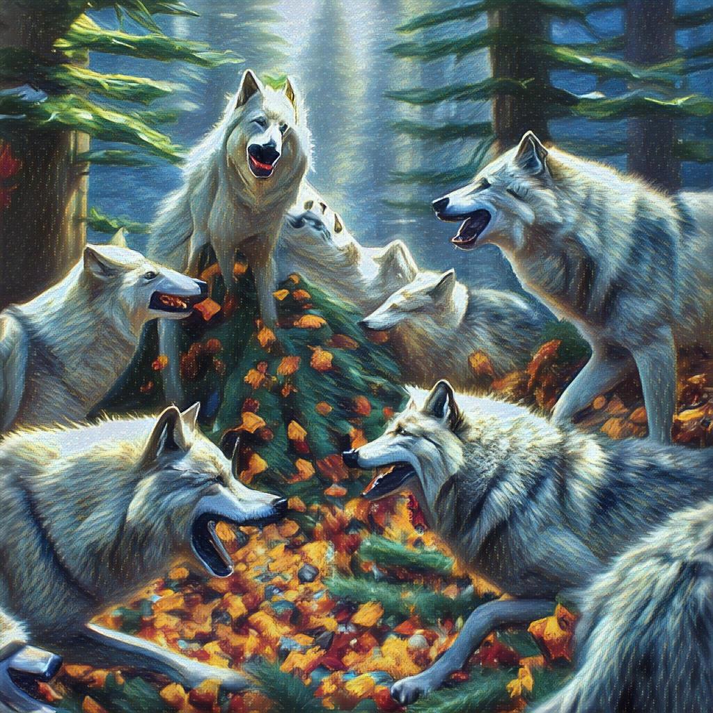 Там , рядом с опушкой , прижавшись спиной к раскидистому дубу , отбивался от трёх волков сухой веткой какой-то седой дедок . Волки были худые , злые — глаза горят , зубы щёлкают . Старичок уже еле ноги переставлял , того гляди упадёт .
