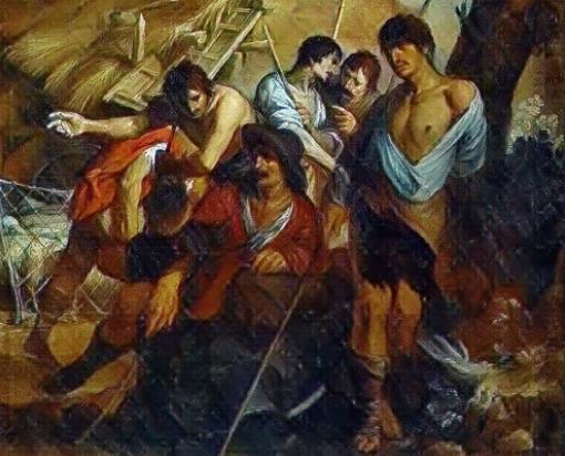 Тут Элиас увидел и пленников . На другом конце поляны , связанные друг с другом толстой верёвкой , сидели они . Среди всех выделялся — сам Король . Элиас сразу его признал . Во-первых , плащ расшитый золотом , а во-вторых , корона , хоть и съехавшая набекрень от страха , а всё видать . Рядом с Королём сидели перепуганные егеря , придворные в измятых камзолах , и три толстеньких человечка в широкополых шляпах . Как потом узнал Элиас — королевские министры .