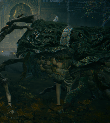 Вижу, как тело Отпрыска летит стремясь приземлиться под статуей как я понимаю Марики стоящей перед зверем Элдена?