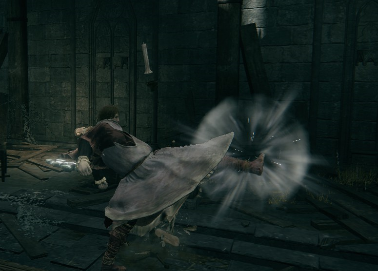 Тело моего противника с грохотом приземляется. Я использую чудо ветра, усиливающее мои движения, повышая скорость и силу, окутывающими меня порывами ветра. Мне удаётся уклоняться от опасных и стремительных, но довольно прямолинейных движений Отпрыска, я изучаю его. Он умело использует свои огромные украшенные орнаментом мечи, нанося последовательные атаки с одной стороны, предназначенные для ловли уклоняющегося оппонента, но помощь ветра, делает меня, просто слишком вёртким для попадания на подобные уловки.