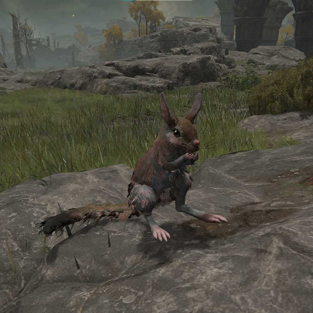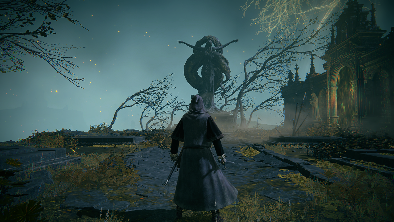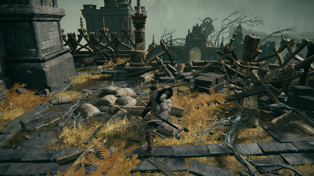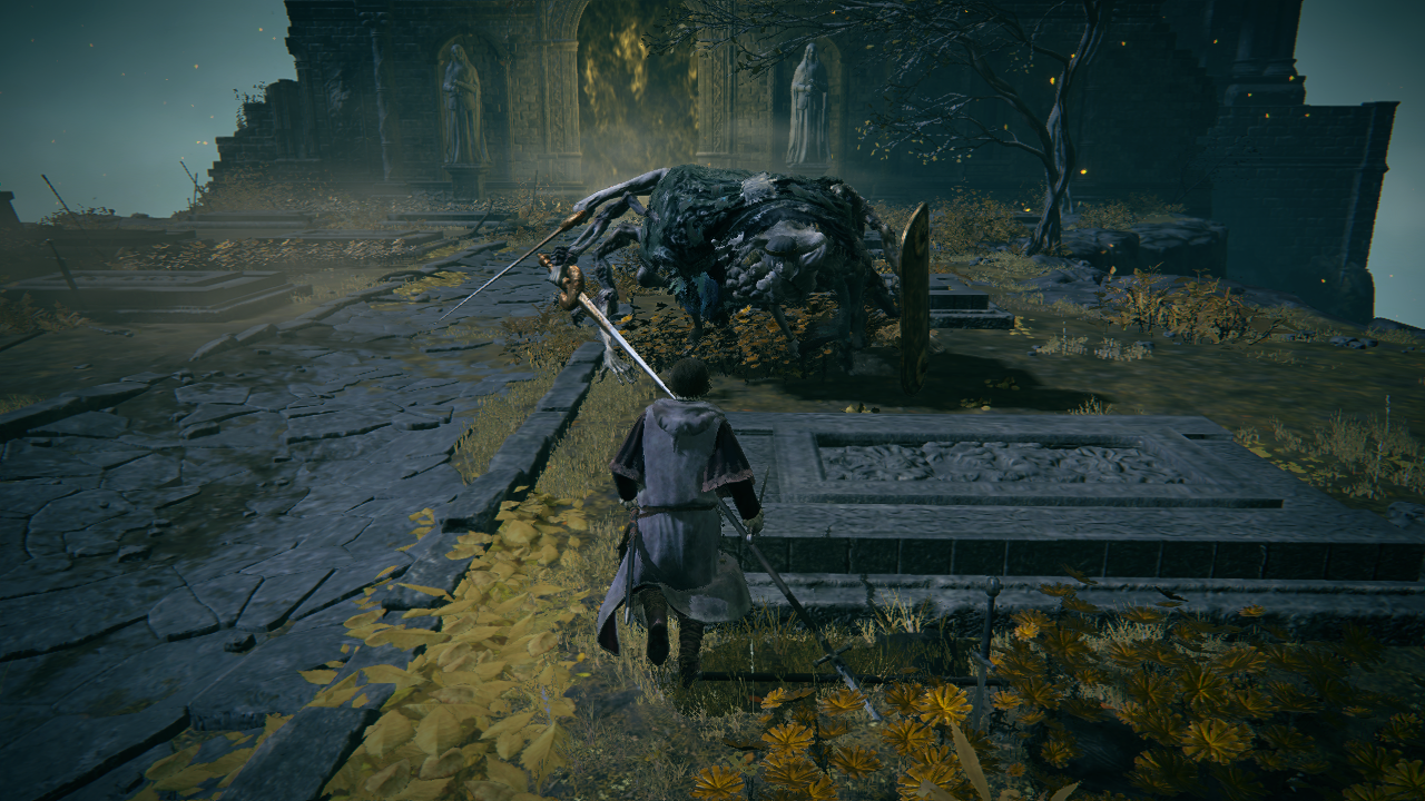Выхожу на поле будущего столкновения, повсюду надгробия, воткнутое в землю оружие и согнутые ветром деревца. Интересно, здесь сражались и погибли, такие-же как я, призванные сюда, и от них осталось оружие? Или ещё какие битвы тут происходили? Может, это проявление скрученности пространства-времени как в Дарк Соулс? К сожалению, ничего не помню про пространство-время в Кольце Элдена, кроме того что некий дракон Пласидусакс засунул себя во временную аномалию.