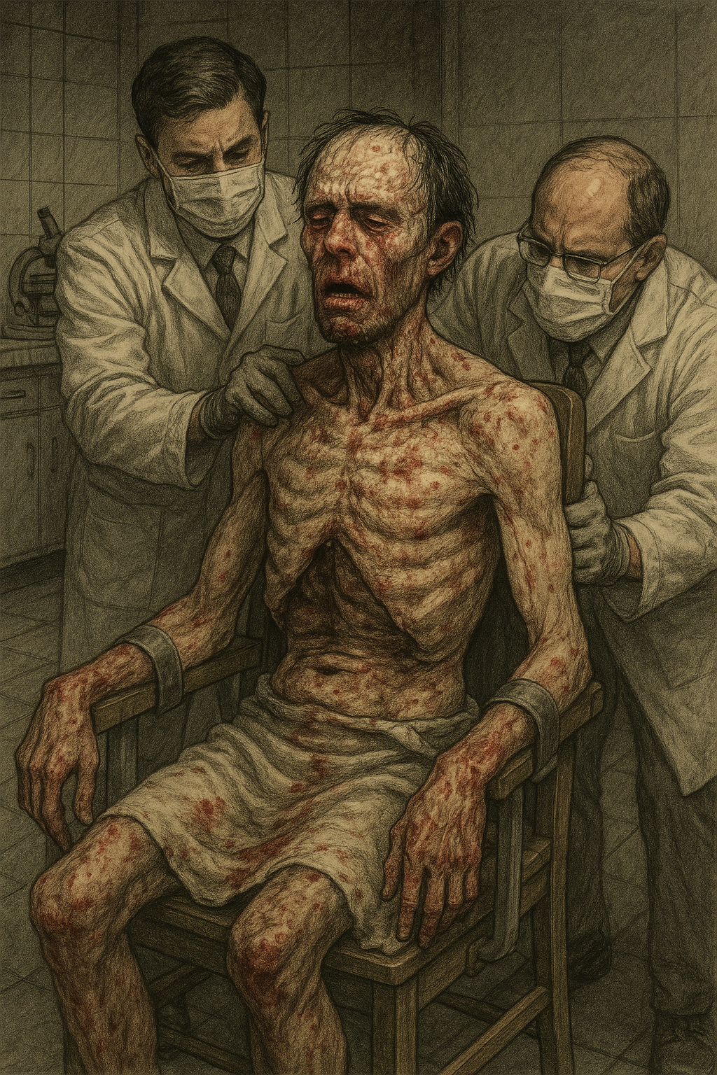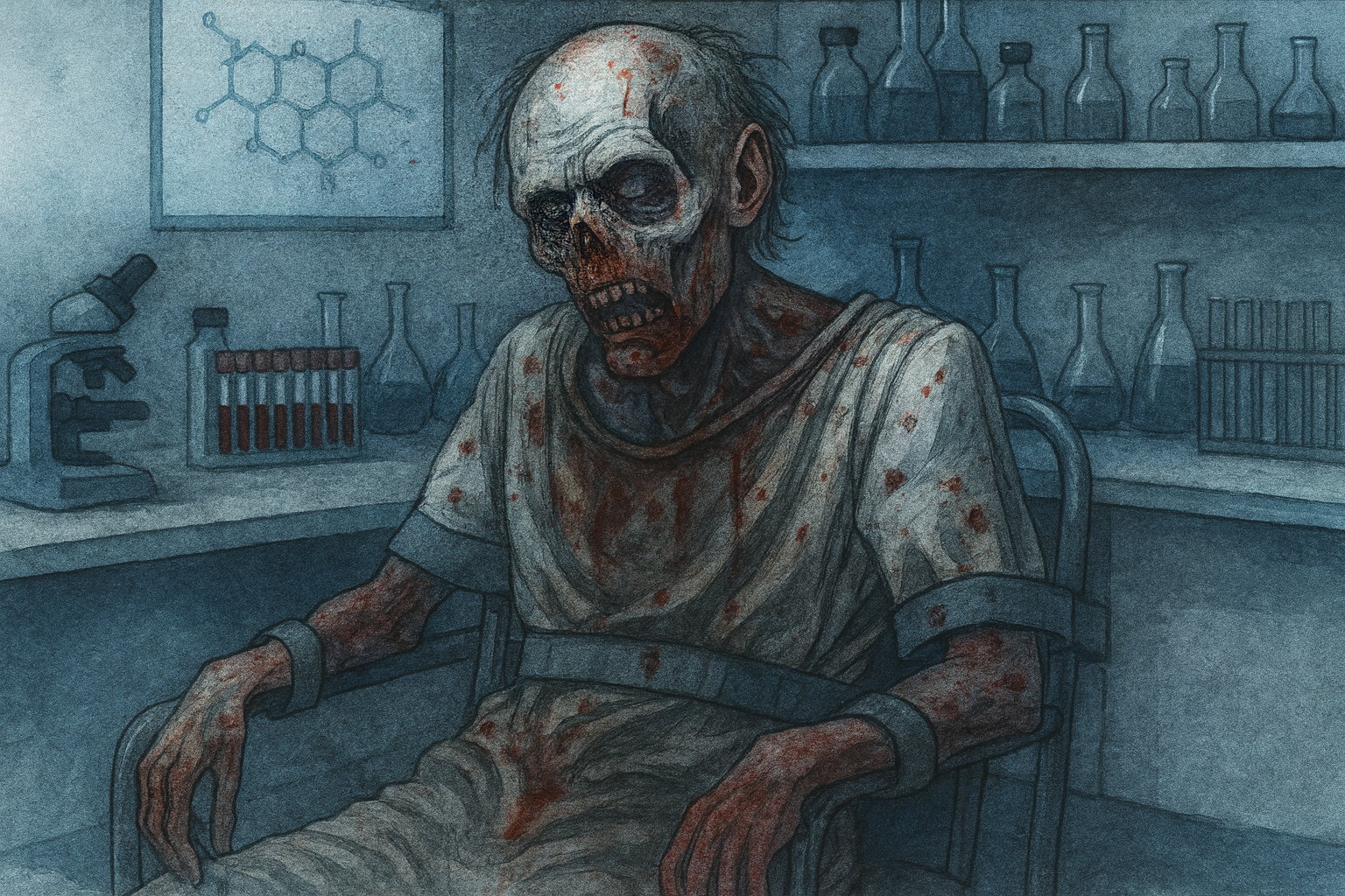 - Да как ты... В-военные пришли! Они привели какую-то тварь с поверхности и наказали нам найти способ её вылечить. Ну или изучить поскорее. - Джим не стал вновь меня тянуть и пошёл в лабораторию, а я же неспешно вернулся в свою комнату, чтобы надеть свою чистую форму и привести волосы в порядок. Через какое-то время я пошёл в лабораторию. Уже по пути туда я почувствовал какой-то странный, противный запах гниения, что совсем не присущи ни одной из известной мне форме существ. Даже разлагающие бактерии пахнут иначе. Тяжелый запах, который попросту невозможно ни с чем спутать... густой, сладковато-приторный запах. Когда я вошёл в лабораторию, то увидел своих коллег, на них была защитная одежда и респираторные маски, а после я увидел его... пожилой мужчина, в рваной одежде. Он сидел прикованный к стулу. Не знаю кто, но его приковали довольно крепко, подобные приспособления я видел лишь в фильмах, когда работали с "особо буйными" в психиатрических отделениях. Меня сразу предупредили, что не стоит с ним играть, ведь это может быть опасным.