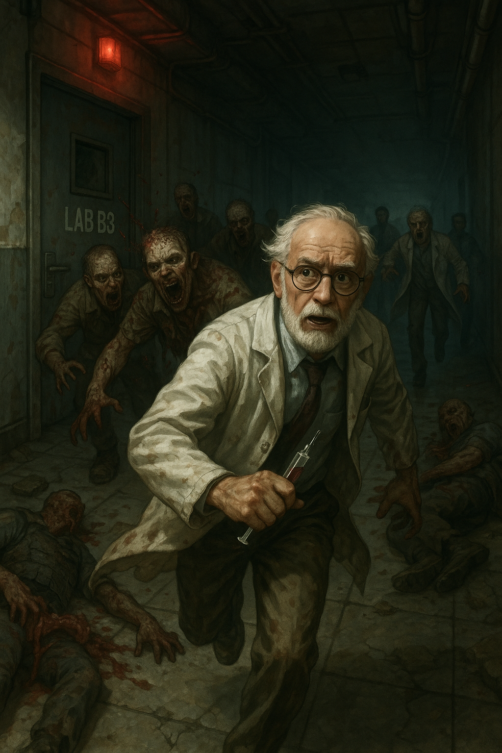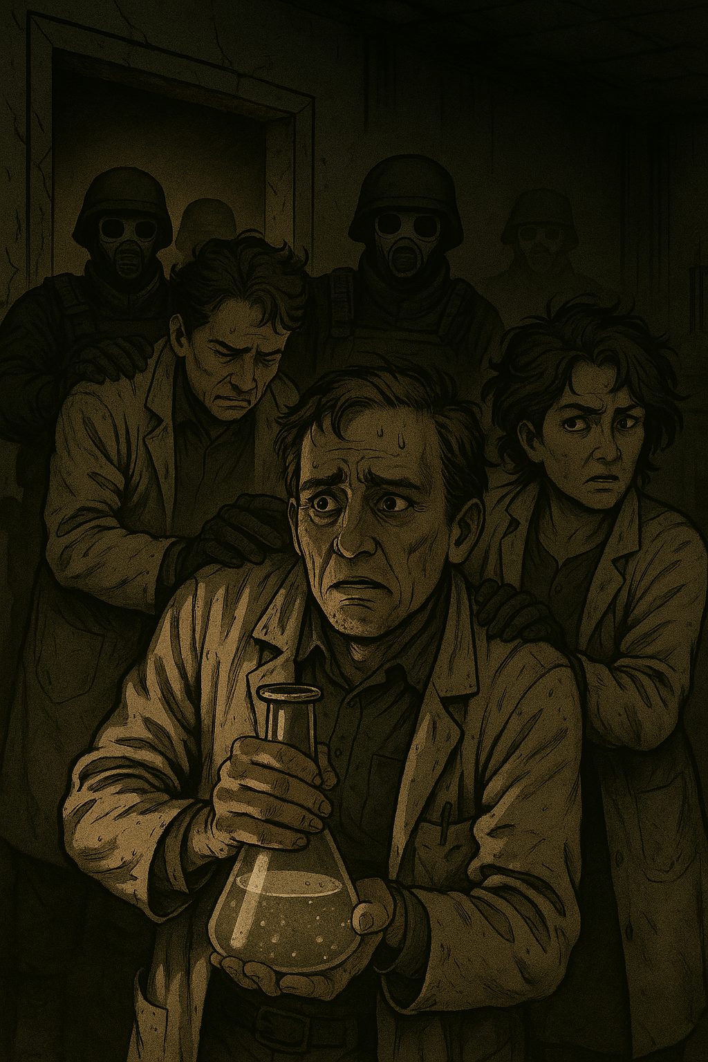 Военные знали, что в лаборатории заражённые, они ждали до последнего, не вмешиваясь считая, что мы можем быть полезны, но... мы так и не смогли убедиться в том, что вакцина правда действует. В дверь ударили так, что бетон вздрогнул. Фонари прожгли темноту лаборатории, я на секунду ослеп. Они вошли молча, без слов, только холодные силуэты в белых масках. Я прижал к груди колбу с образцом, мои руки дрожали. Я хотел крикнуть, что лекарство уже здесь… но не смог...