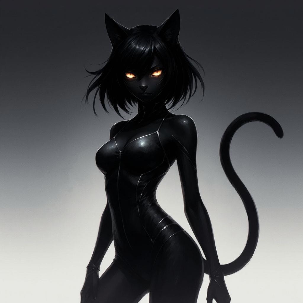 Всё же это была… женщина-кошка! Лицо частично имело кошачьи черты, большие оранжевые глаза с тёмно-фиолетовым вертикальным зрачком, кошачьи ушки, торчащие из не очень длинных чёрных волос. Фигурка незнакомки была изящна и красива. У девушки была отличная стоячая грудь, размером где-то между вторым и третьим, совсем узенькая талия, длиннющие подтянутые ножки и строгое выражение лица.