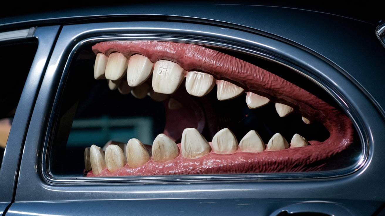 Решив, что единственный выход — выпрыгнуть прямо на ходу, я тянусь к кнопке, чтобы опустить окно. Но вместо привычного звука опускающегося стекла происходит нечто невообразимое. Стекло будто плавится, а затем превращается в огромную зубастую пасть, которая с громким щелчком захлопывается прямо у меня перед лицом.