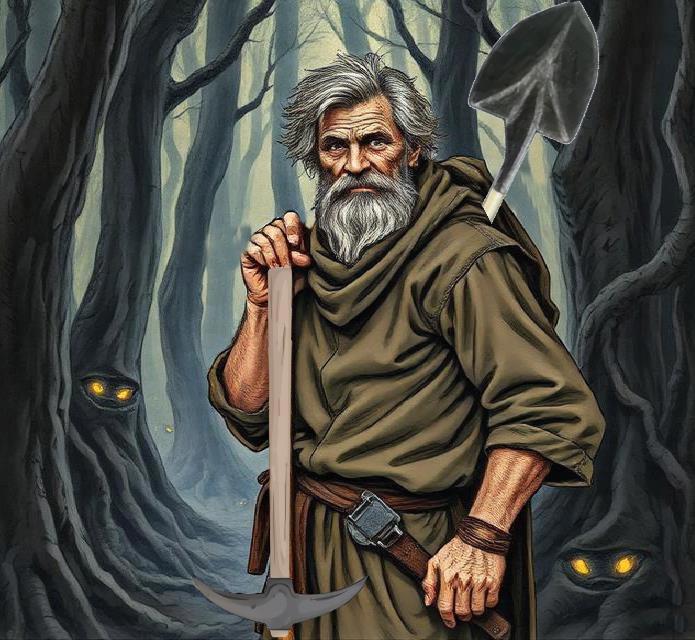 Это был горный Гном . Он не двигался , и его легко было принять за причудливость оголившейся породы — плащ из слоистого сланца , борода из седого лишайника и окаменевших корней . Лишь глаза , как два отполированных до блеска голубых сапфира , мерцали в глубине под капюшоном , наблюдая за любым приближающимся существом .