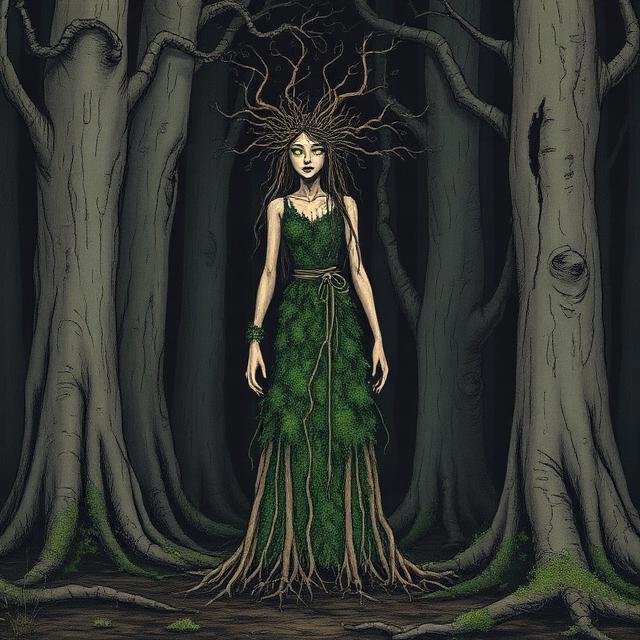 Но тут лес ожил . Однако не от радости . Из чащи , бесшумно ступая по траве , вышла Хозяйка Чёрного Ельника . Не фея и не призрак , а сама душа этого древнего , мрачного места . Она была высокая , одета в одежду из живого мха и свисающего лишайника , а волосы у ней были сплетены из корней и зелёных веточек . Глаза её светились , подобно светлячкам в глубокой ночи .