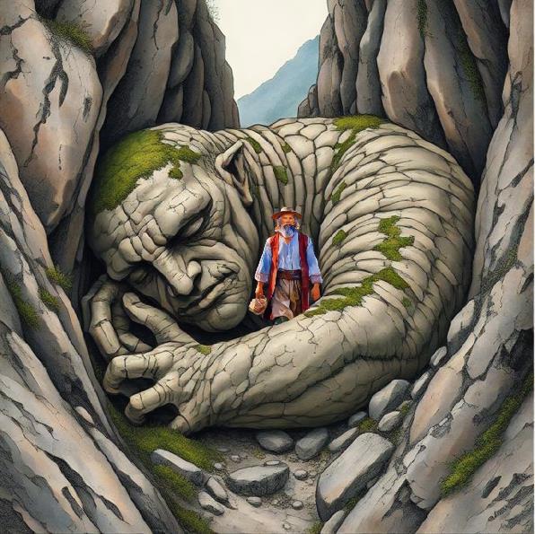 Дорога привела Йохана к узкому горному ущелью . Но проход в него был полностью загромождён огромной , бесформенной глыбой . Присмотревшись , Йохан с замиранием сердца увидел , что это не просто глыба , а Каменный Великан , свернувшийся «калачиком» во сне . Его тело было сложено из валунов , поросших серым лишайником , а тихое , размеренное посапывание вызывало лёгкую дрожь в земле . Он спал веками , и его сон был таким глубоким , что даже ветер уже перестал тревожить это место .