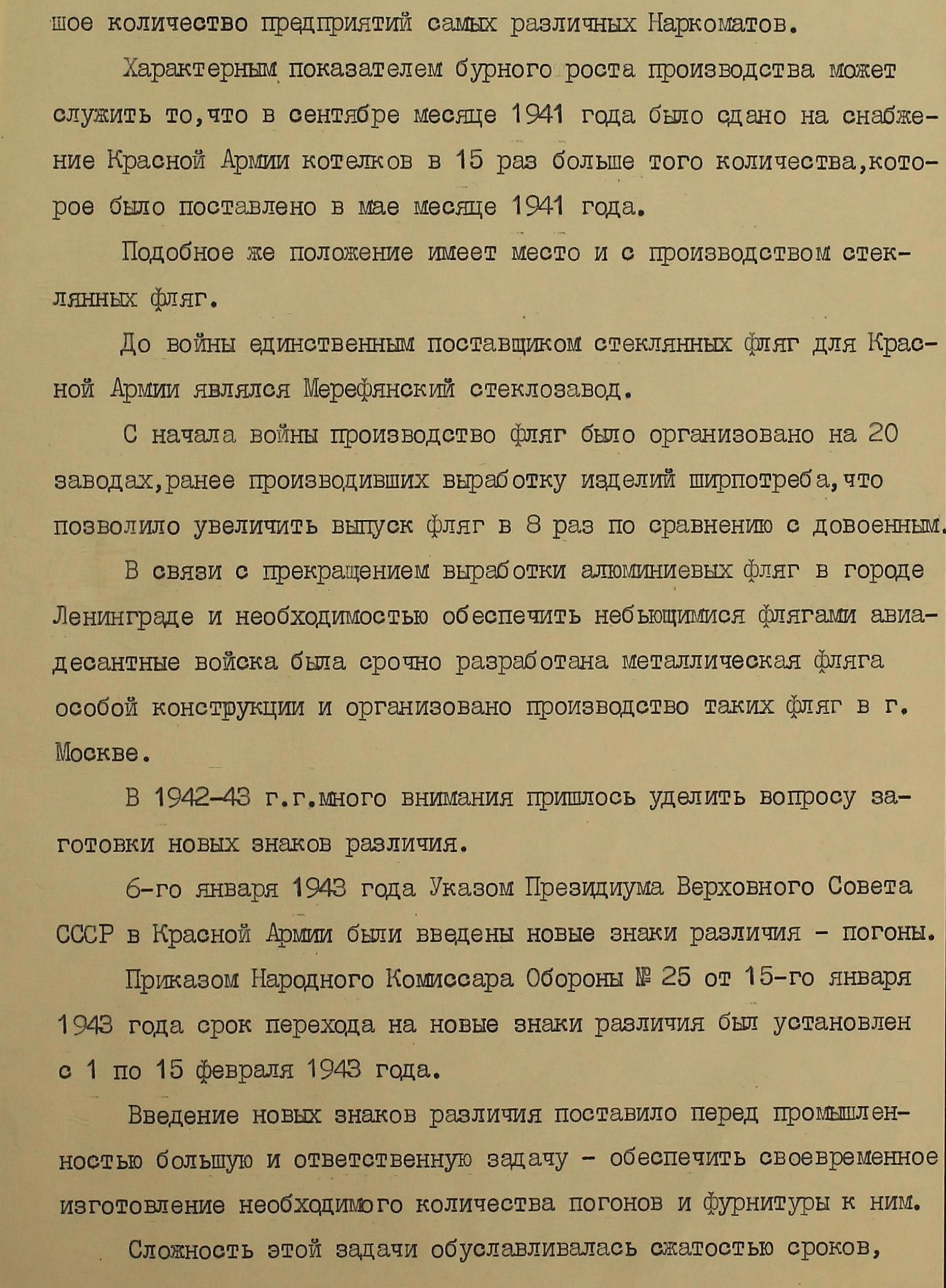 При обсуждении этого вопроса у Сталина возникло сомнение в целесообразности проведения этого мероприятия. «Если погоны будут носить гвардейские части, то как будут выглядеть остальные части действующей армии?» Обменявшись мнениями, мы тут же получили задание подготовить предложения о введении традиционных погон русской армии для всех военнослужащих Красной Армии. Прежние намерения о введении особой Формы одежды для гвардейских частей Красной Армии не получили дальнейшего развития, так как все убедились, что введение в форму гвардейских частей гимнастерок и шаровар из шерстяной ткани защитного цвета и шинелей из сукна лучшего качественна нам пока не под силу. Тогда мною было дано распоряжение о немедленной разработке проекта погон, с изготовлением образцов погон к полевой, повседневной и парадной форме одежды всего личного состава Красной Армии.».