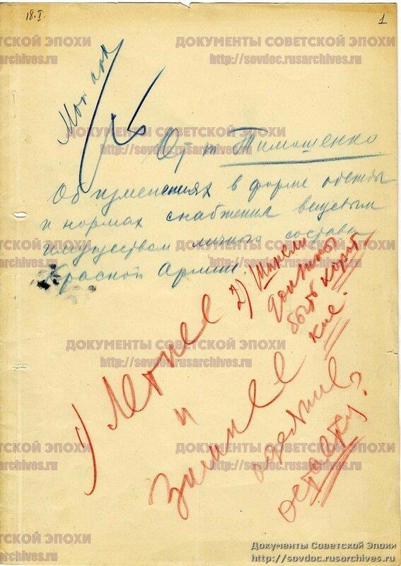 А сам И.В.Сталин к вопросам вещевого обеспечения относился очень внимательно, достаточно внимательно посмотреть на проект постановления Совета Народных Комиссаров Союза ССР 1940 года «Об изменениях в форме одежды и нормах снабжения имуществом личного состава Красной Армии в мирное и военное время и о применении заменителей для людского и конского снаряжения». В докладе на имя секретаря Центрального комитета Всесоюзной коммунистической партии (большевиков) И.В.Сталина, секретаря Совета Народных комиссаров СССР (СНК СССР) В.М.Молотова и председателя Комитета обороны при СНК СССР Маршала Советского Союза К.Е.Ворошилова к проекту Постановления, сказано «Существующая форма одежды для личного состава Красной Армии крайне многообразна по покрою и цвету…», «Не меньшее разнообразие существует и в форме спецодежды, заготовляемой в значительной части из остро дефицитных материалов (кожа, льняные ткани)», «основные предметы обмундирования и обуви отпускаются лишь в одном комплекте», «Все это вместе взятое крайне осложняет заготовку обмундирования и снабжение им, затрудняет маневрирование им…».