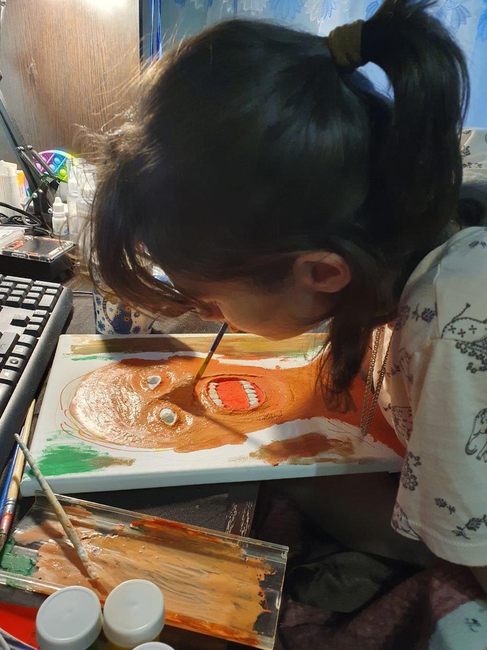 Молодая художница Маринетт Мортем сосредоточенно работает над своей картиной. Она раскрашивает гуашью кричащее лицо, вылепленное из папье-маше. В глазах Маринетт горит огонь вдохновения, а руки уверенно держат кисть. Эта фотография передаёт атмосферу творчества и страсти, которые наполняют сердце художницы в процессе создания произведения искусства.
